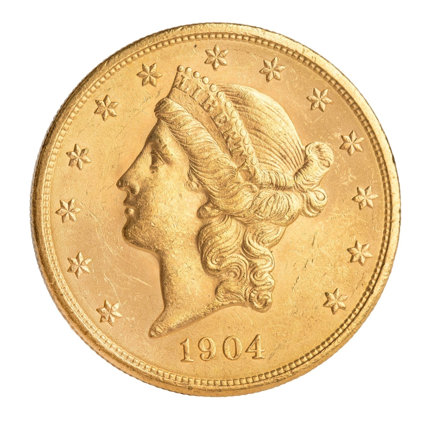 1904 Liberty Head $20 gold coin; United States shield and eagle verso, 33.43g, aEF. (Image 1)