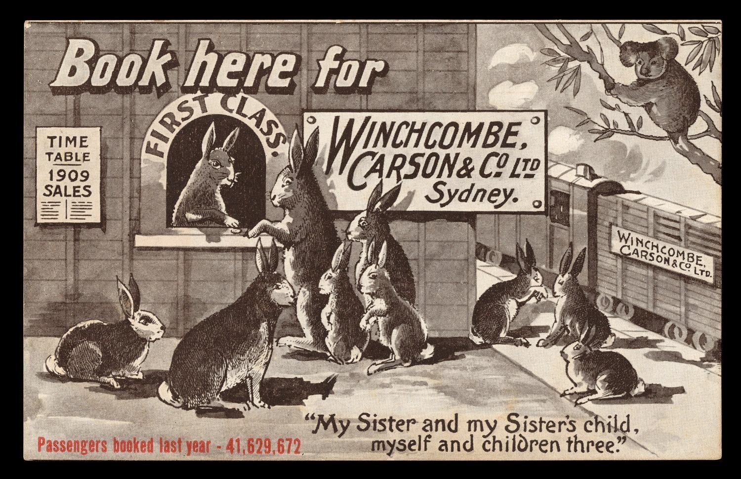 station agents) depicting a family of rabbits at a "First Class" ticket office, dated 1909, with the additional information "Passengers booked last year - 41,629,672"; the scene overlooked by a koala and the ticket agent a