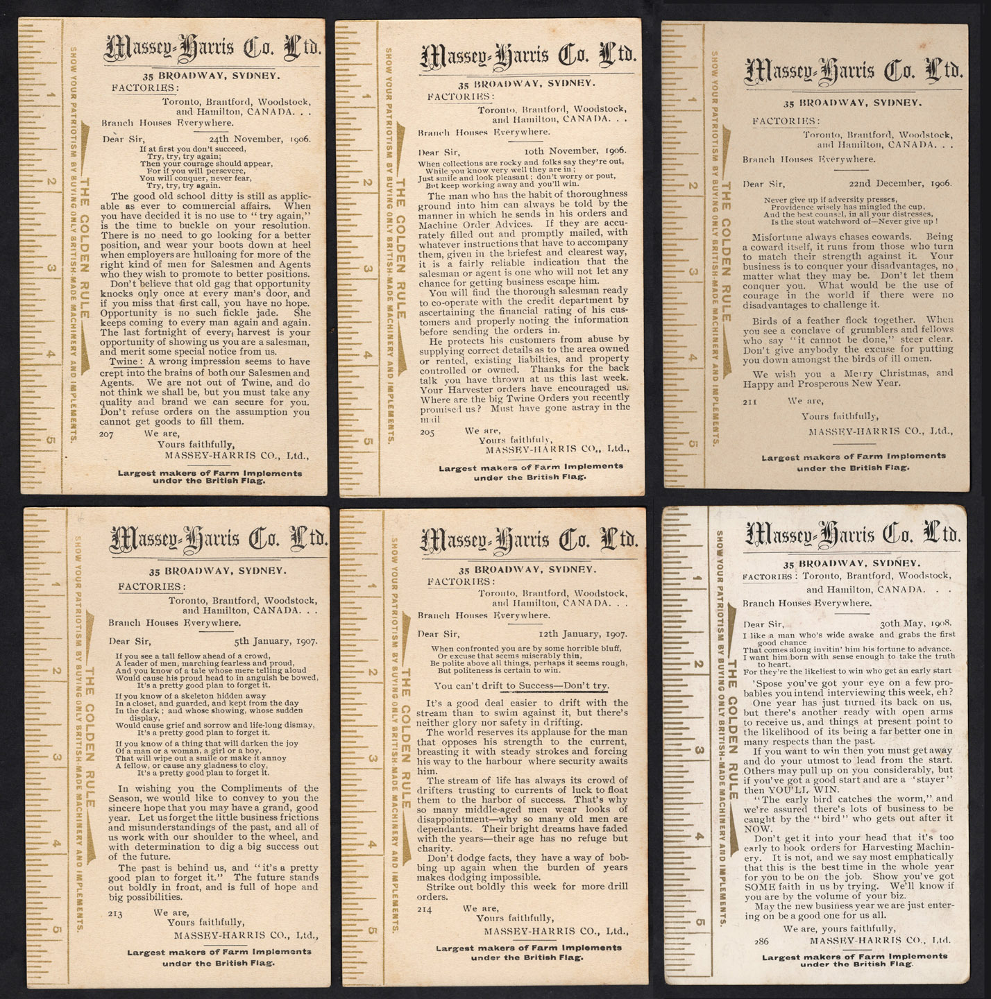 AGRICULTURE: A group of six postcards with printed messages from MASSEY-HARRIS Co., Ltd., dated 1906-08; all additionally with