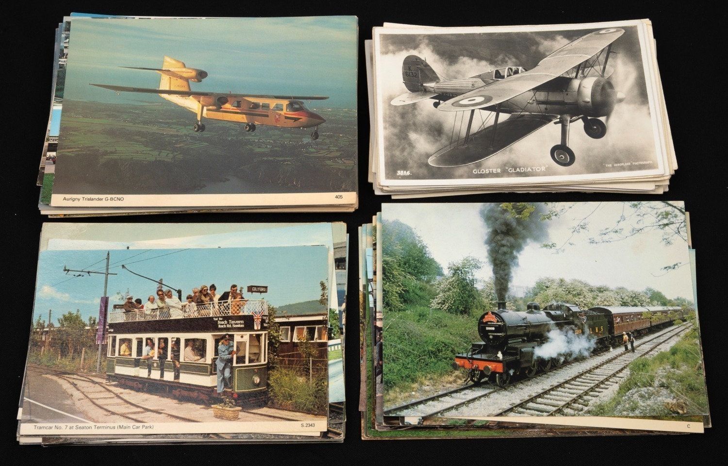 POSTCARDS - TRAINS, PLANES, AND AUTOMOBILES: Diverse accumulation issued in decades spanning the 1900s to the 1980s, the planes