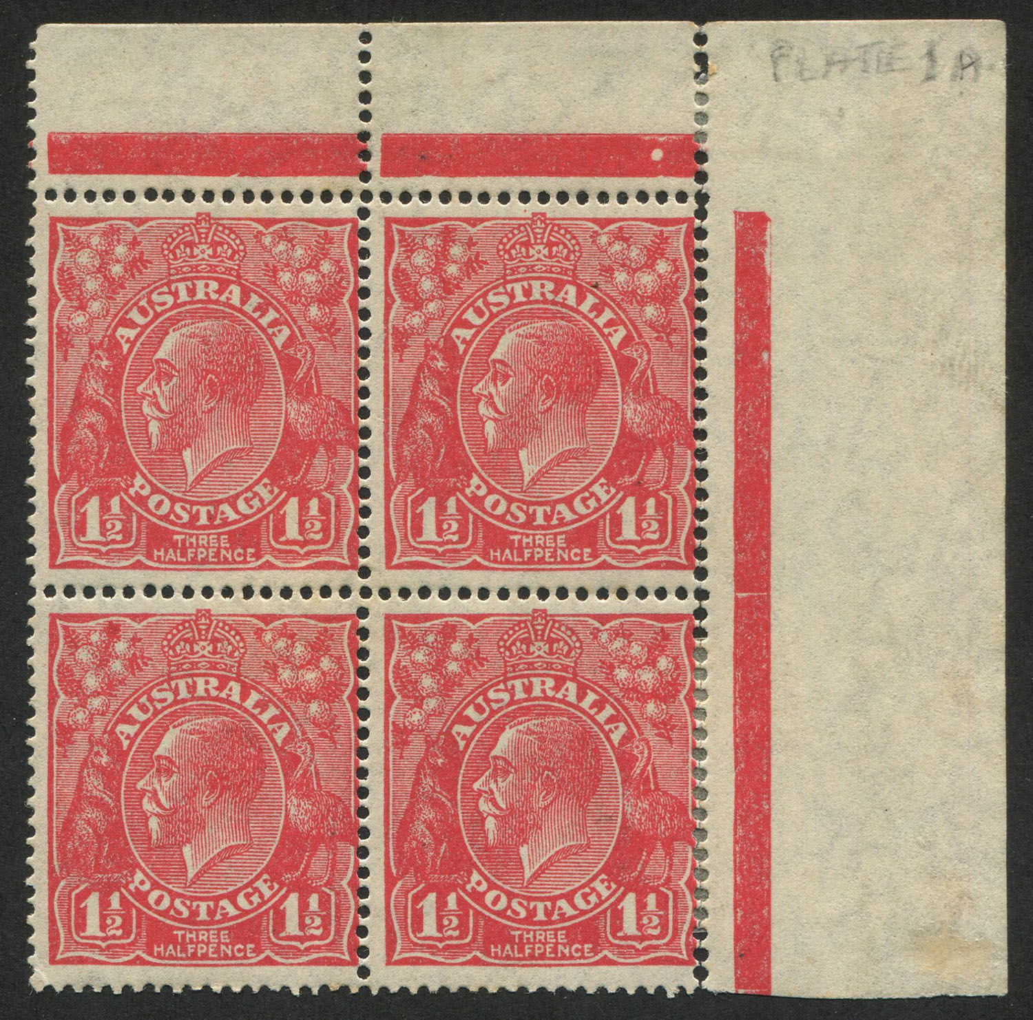 include Plate 1a Plate dot block of 4 (perf reinforcing, Cat.$1250), DOUBLE PERFS affecting the lower 3 units of a corner block of 6, and on a perf 'OS' pair, SLURRED PRINTING block of 4 & single; plate varieties with "White flaw at