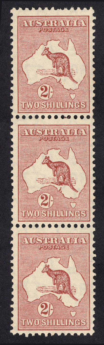 2/- Maroon (SG.134) vertical strip of 3, the top unit with "White flaw in Gulf og Carpentaria" variety; the middle unit