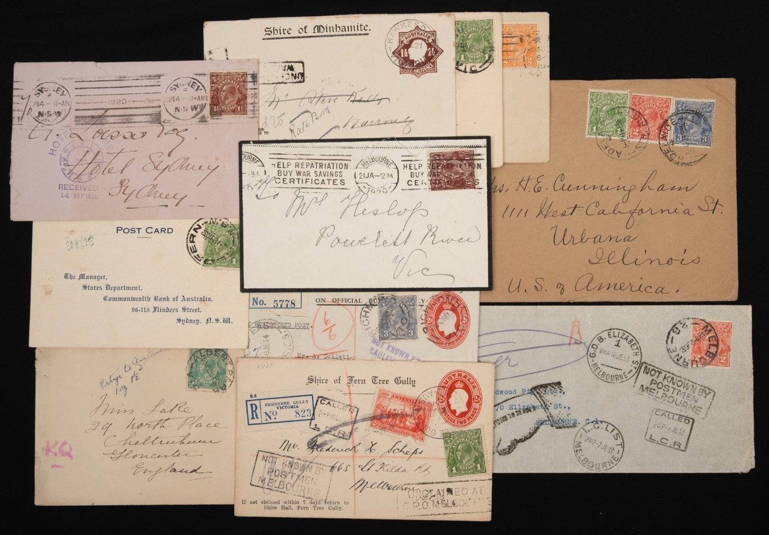 1933 2d red "Return to Sender" pointing finger; 1934 Reg'd 2d Envelope + 3d blue "UNCLAIMED"; 1d on 1936 Printed Matter rate to Switzerland; 1d, 2d & 3d on 1936 cover to USA; etc. (11 items). (Image 1)