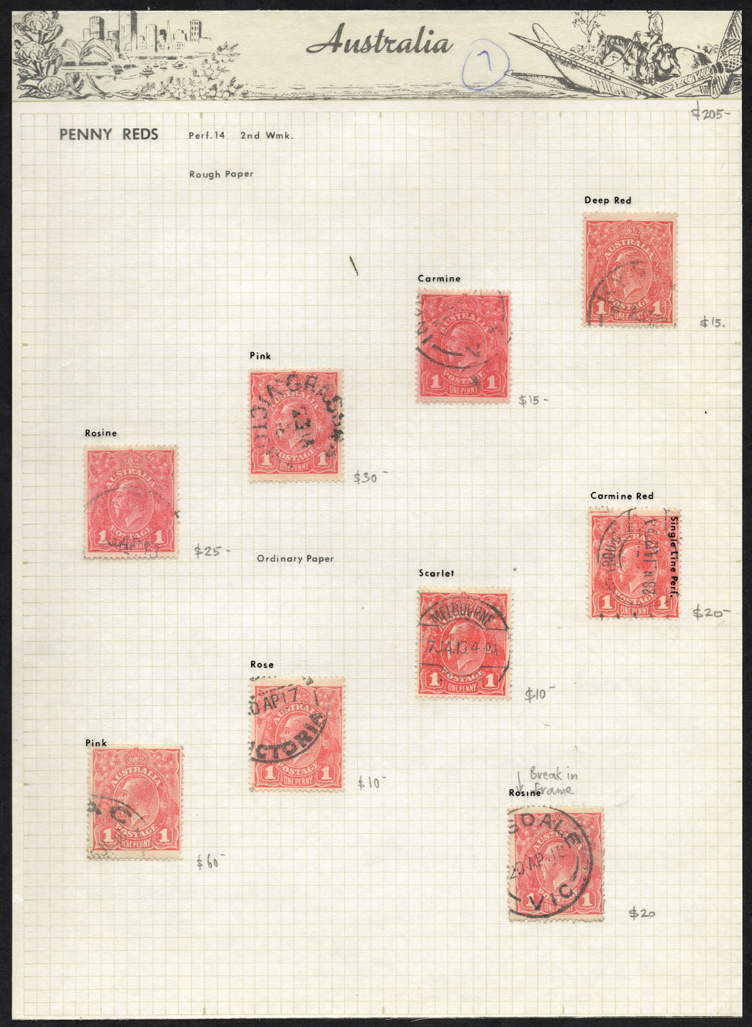 A range on annotated album pages, with 1d Reds - shades and varieties, 1d Greens - varieties; and 1½d Reds - varieties.