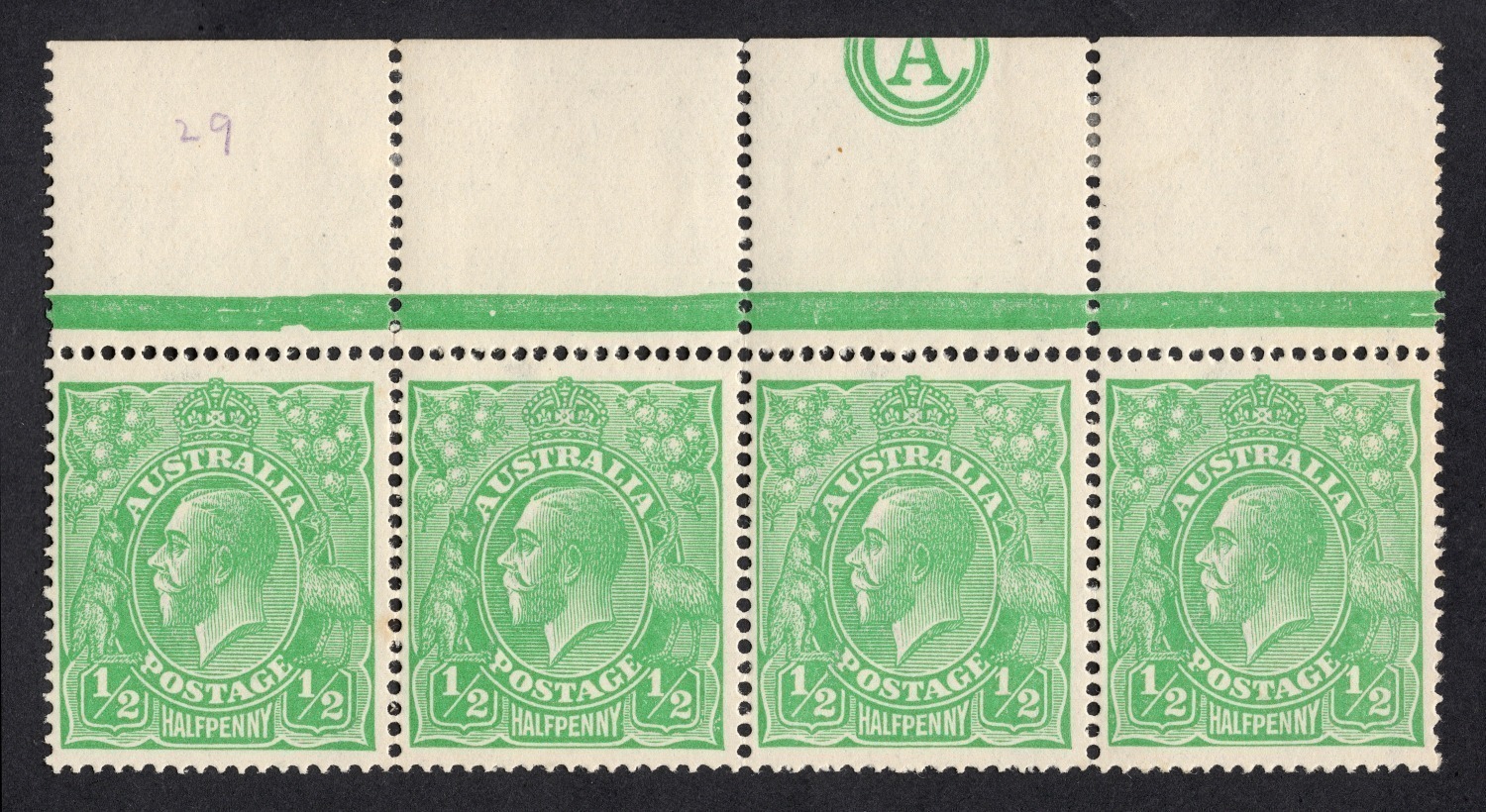 ½d Emerald, strip of four from the top of the pane, unusually with large part CA MONOGRAM (from the pane above!); the