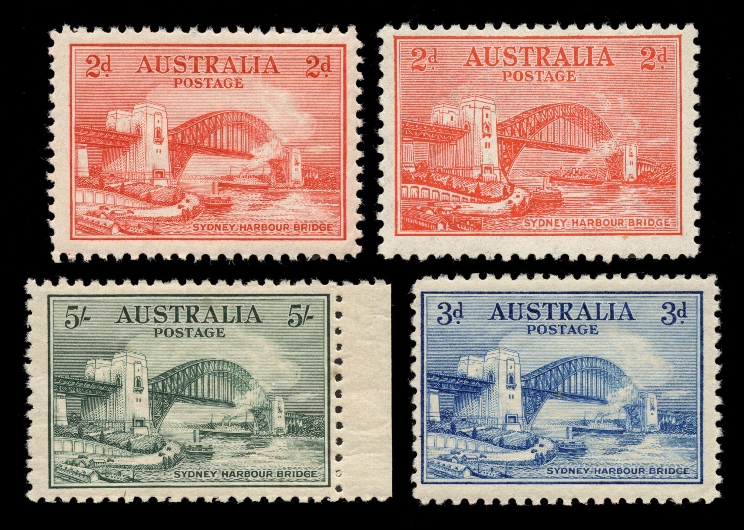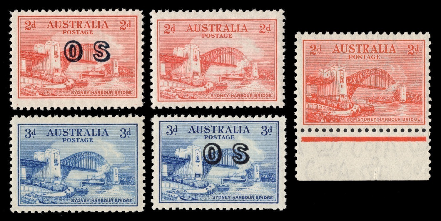 1932 Sydney Harbour Bridge set to 5/- including both 2d printings and the 2d & 3d OS Overprints. (6) all fresh MUH. (Image 1)