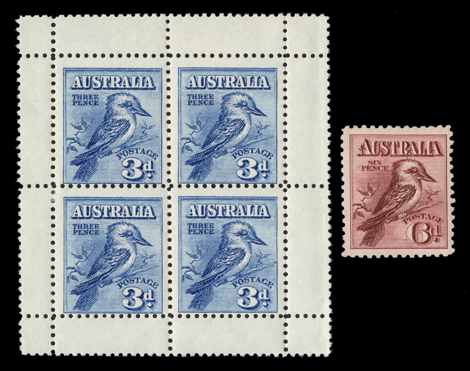 1914 Engraved 6d claret Kookaburra, together with the 1928 3d Kookaburra Exhibition Miniature Sheet, both MUH. (2). (Image 1)