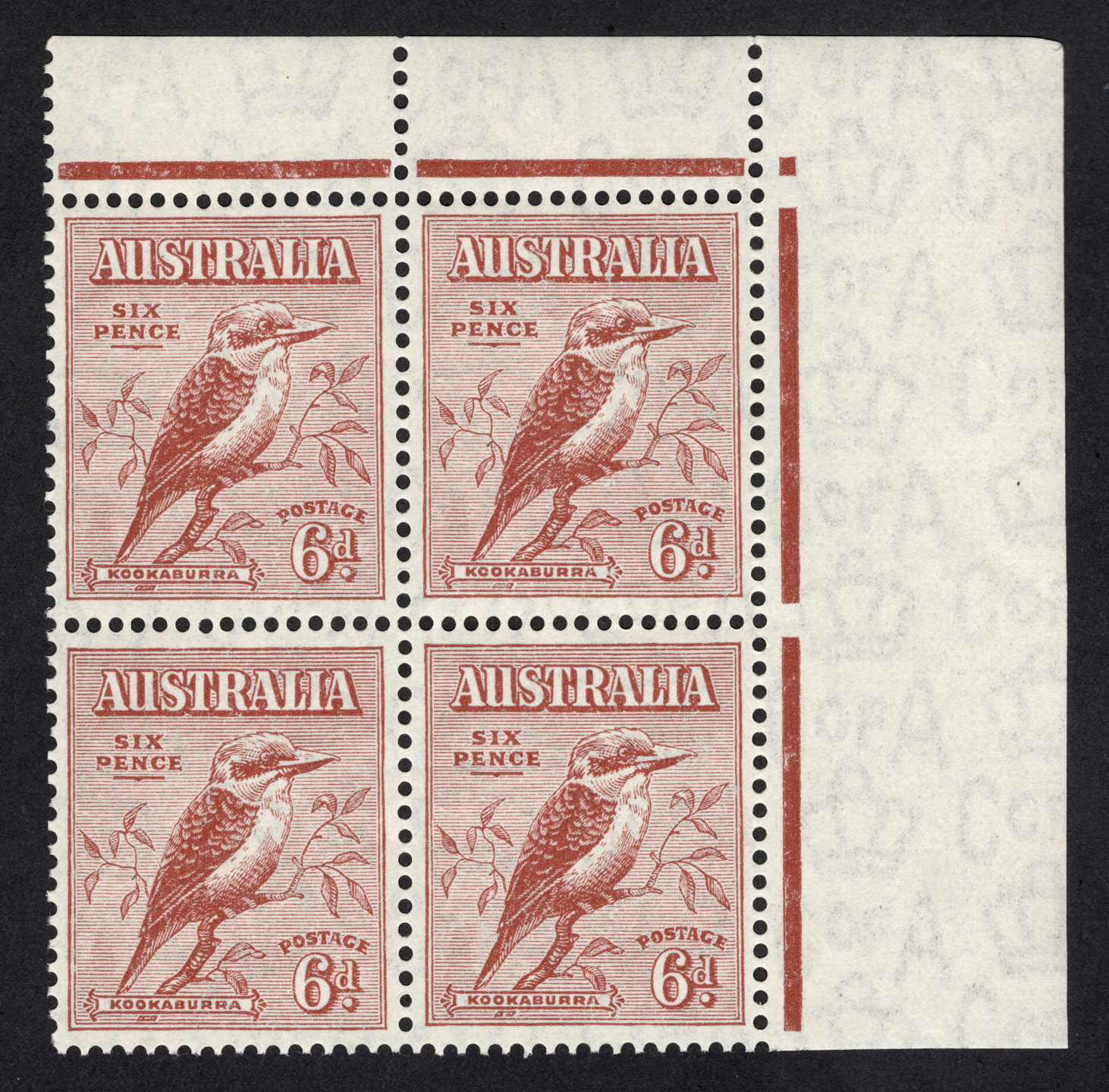 1932 (SG.146) 6d Typographed Kookaburra, upper right cnr.blk.(4), one unit (R12) with constant variety "Broken top to d in