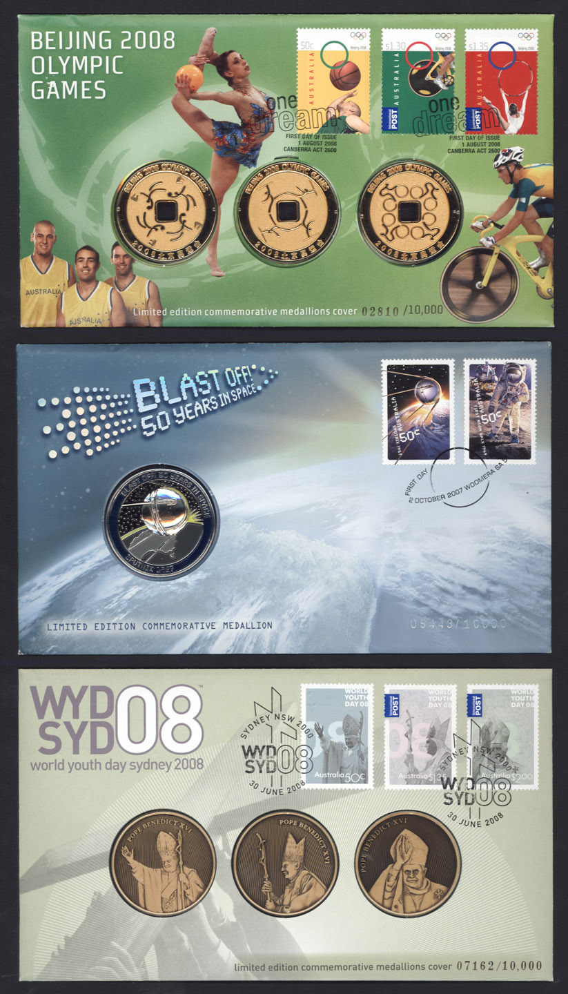 Legends - Sir Donald Bradman", 2000 "For Valour", 2002 Golden Jubilee, 2004 "150th Anniversary Eureka Stockade", 2008 Megafauna (medallion), and others. (Image 1)