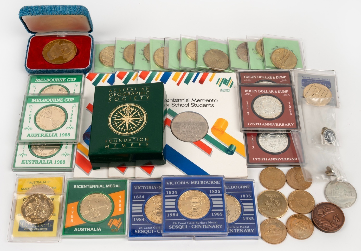 & Dump, 150 years Victoria-Melbourne, and several others, together with two 2001 RAM Federation Centenary pins and an Australian Geographic Society Foundation Member medallion in presentation case with box and CoA. (qty.) (Image 1)