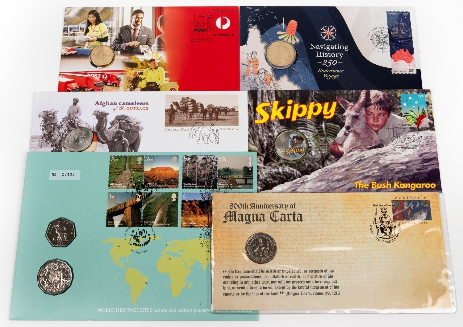 Group of six PNCs comprising 2005 "World Heritage Sites", 2015 "Magna Carta", 2019 "Australia Post",