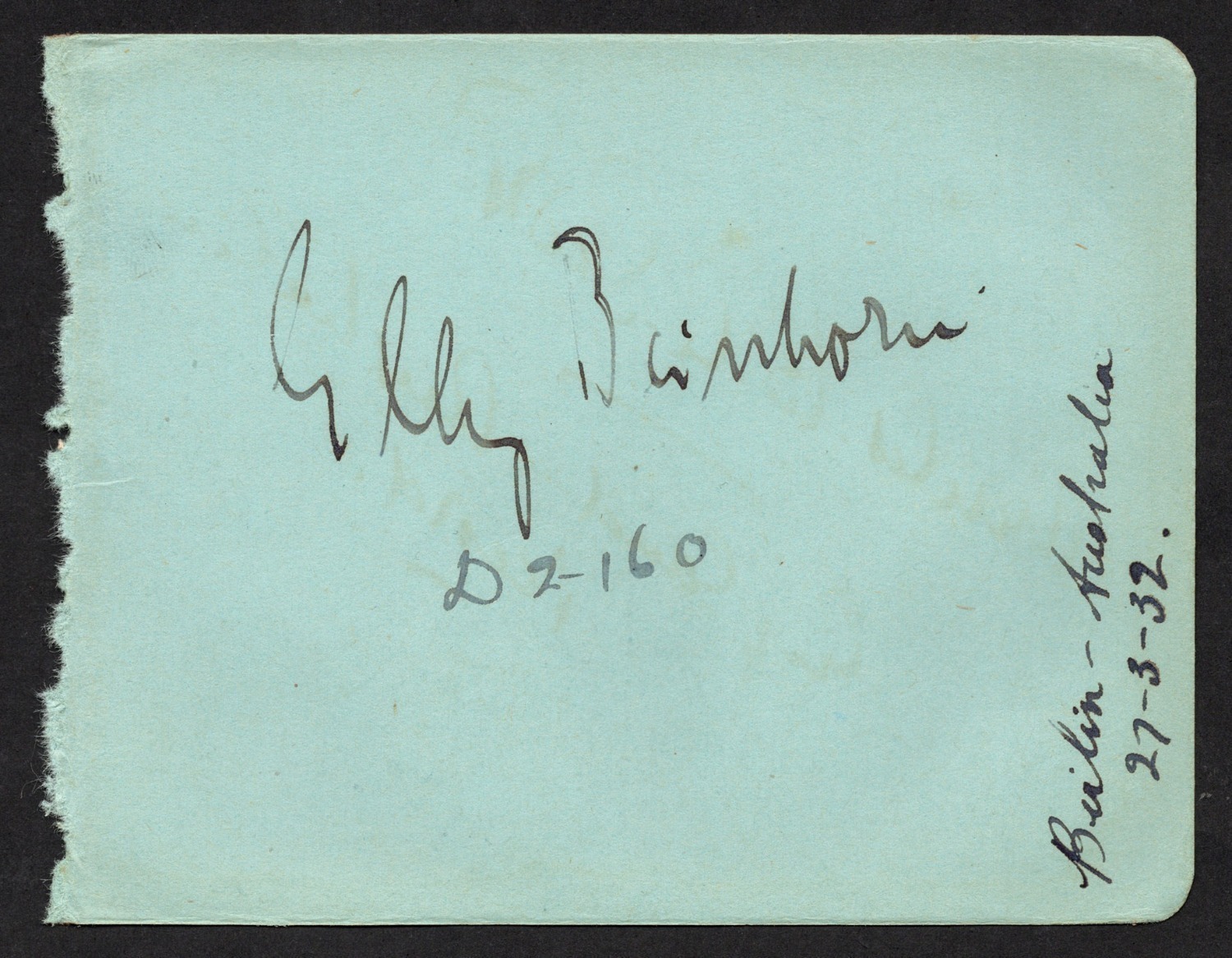 ELLY BEINHORN original pen signature on an autograph page with "D-2-160" (her Klemm Swallow registration number) and