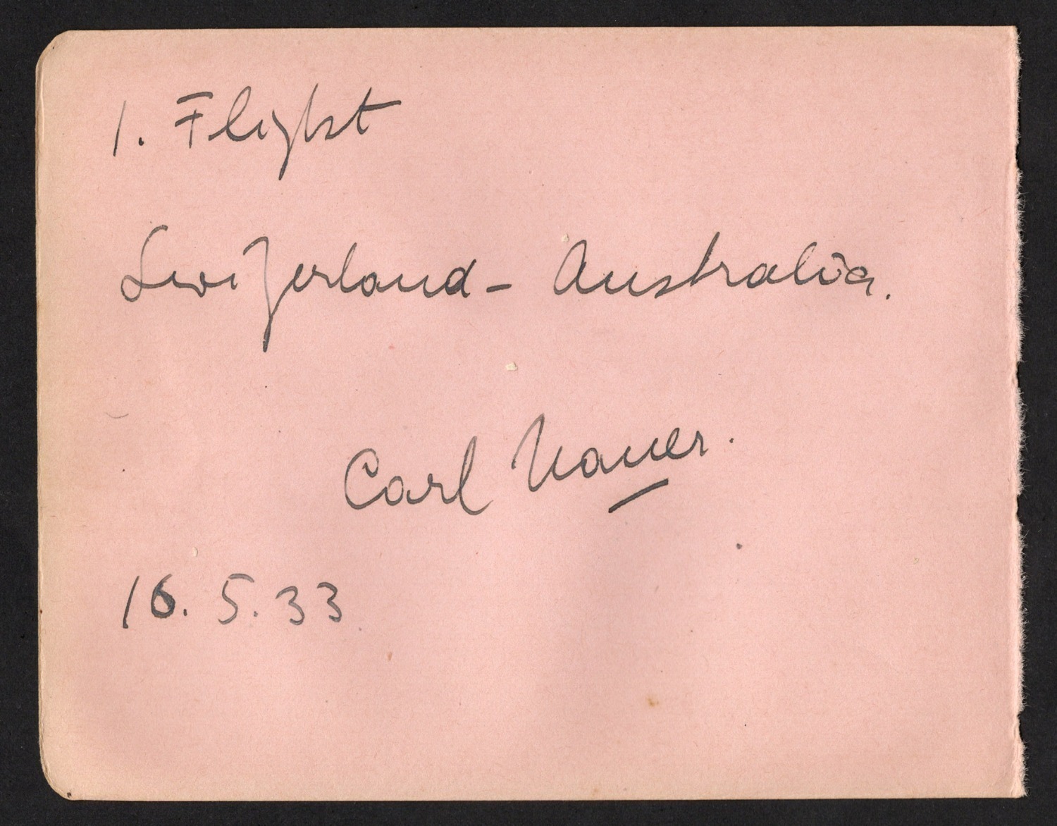 DR CARL NAUER original pen signature on an autograph page titled by him "1. Flight Switzerland - Australia, 16.5.33".