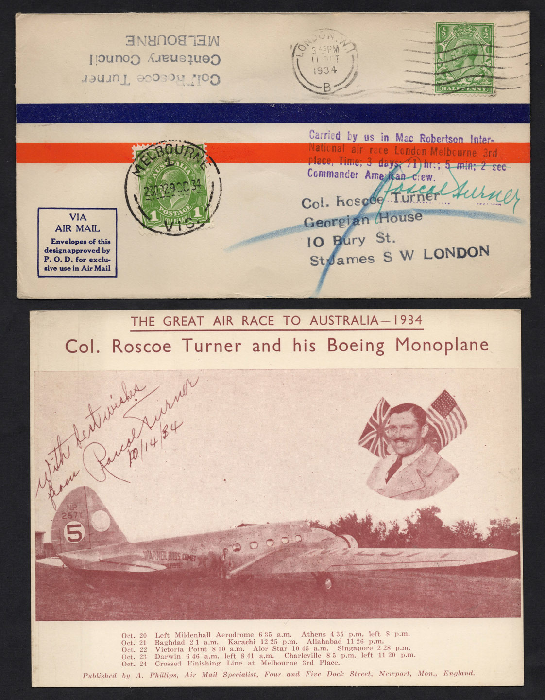 October 1934 (AAMC.434) MacRobertson AIr Race cover, flown and signed by Roscoe Turner, together with an example of his oversized