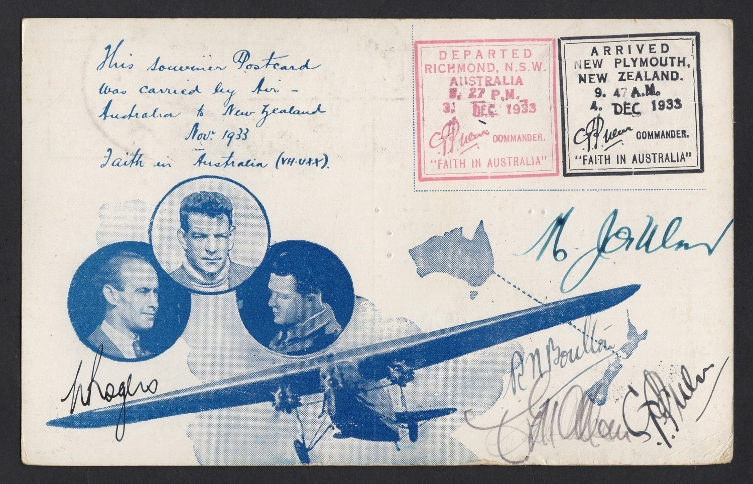 Trans-Tasman flights; the first time in December 1933 signed by Boulton, Allan and Ulm; the second time in April 1934 signed by Rogers and again by Ulm with additional NZ 1d adhesive tied 12th April 1934 before the return flight to Australia.