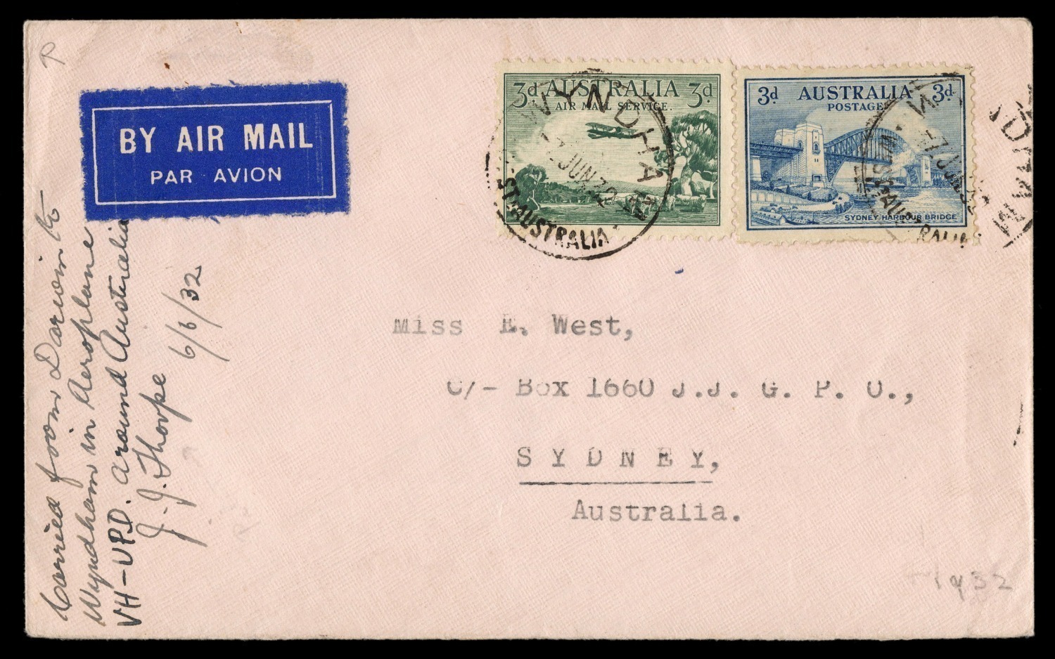 "Carried from Darwin to Wyndham in Aeroplane VH-UPD Around Australia 6/6/32", [one of only 3 flown]. Cat.$500+. (Image 1)