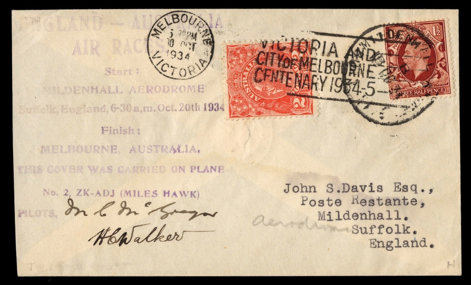 October 1934 (AAMC.440) MacRobertson Air Race cover flown and signed by the pilots, McGregor & Walker; with special cachet; 3