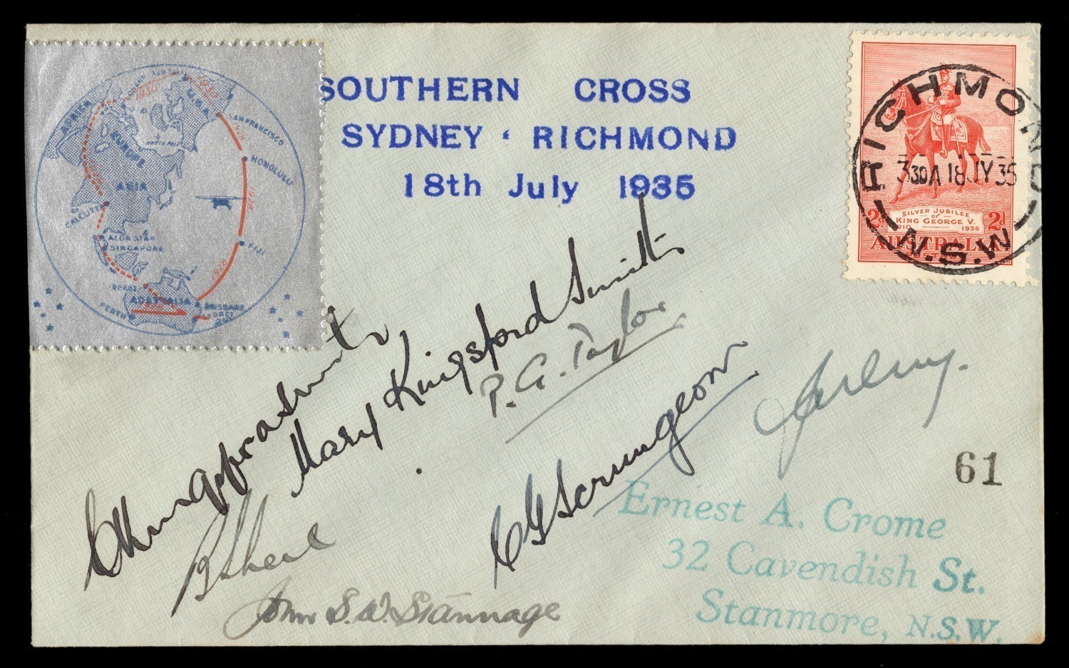 The Last Flight of the "Southern Cross" 18 July 1935 (AAMC.515) a cover (#61) carried from Mascot to Richmond, with