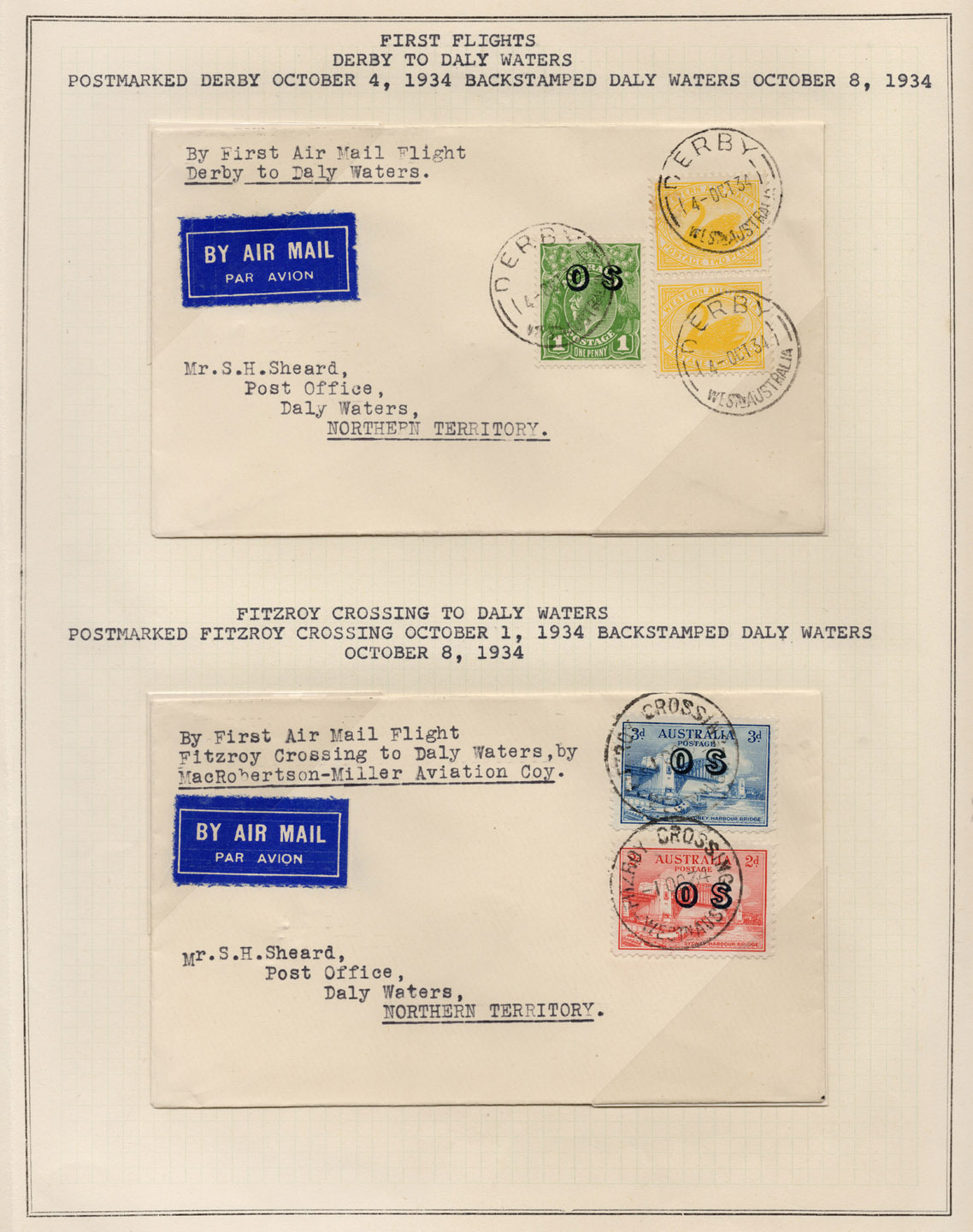 album pages comprising of covers flown all-the-way in both directions, plus intermediates despatched from Derby, Fitzroy Crossing, Roebourne, Whim Creek, Perth, Carnarvon, Onslow, Hall's Creek, Port Hedland, Broome and Daly Waters. (19 flown