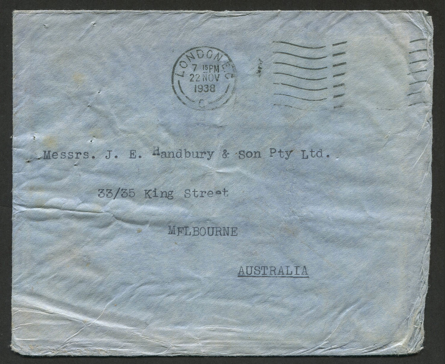 27 November 1938 (AAMC.834) "Calpurnia" crash mail cover from London; addressed to Melbourne; accompanied by the