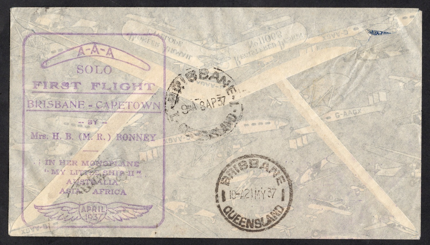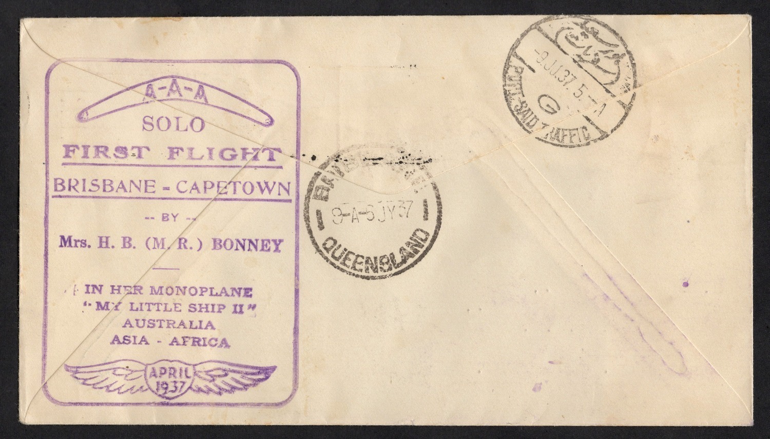 9 April 1937 (AAMC.715c) Brisbane - Nairobi flown cover, carried and signed by Mrs. H.B. "Lores" Bonney on this leg of