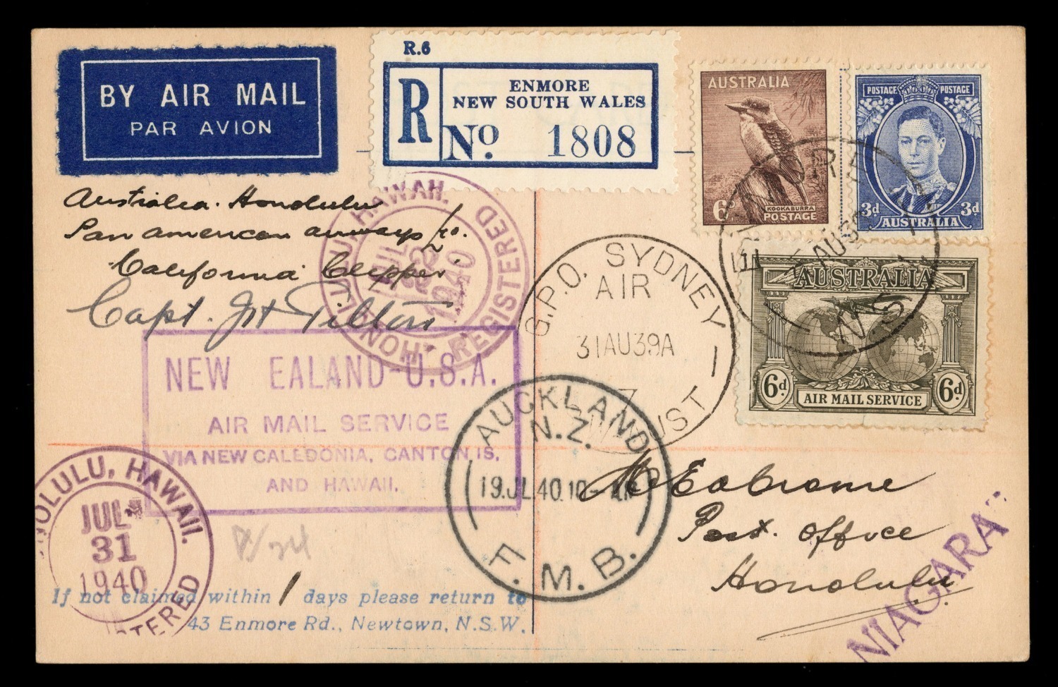 Pan Am California Clipper under the command of Captain J.H. Tilton (who has also signed) carried it from Auckland to Honolulu, where it was stamped on arrival, before finally being returned to the sender in Sydney on 31 August 1940. [According to