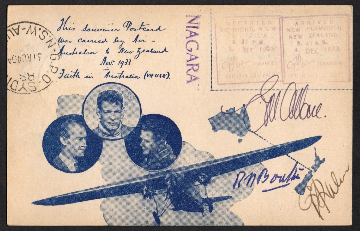 and signed by the crew of "Faith in Australia" Boulton, Allan & Ulm; posted again in August 1939 but carried by RMS Niagara and delayed in New Zealand due to the outbreak of WWII. The card was finally carried again in July 1940 when the