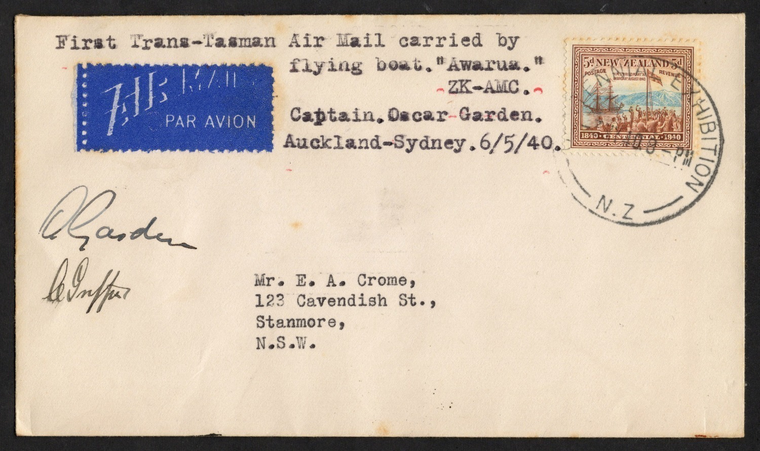 "Awarua" ZK-AMC; commanded by Oscar Garden, who has signed the cover, with Sydney arrival b/stamp. (Image 1)