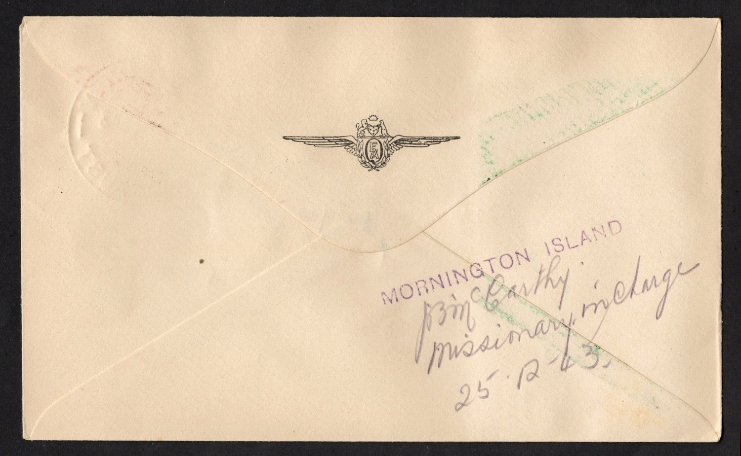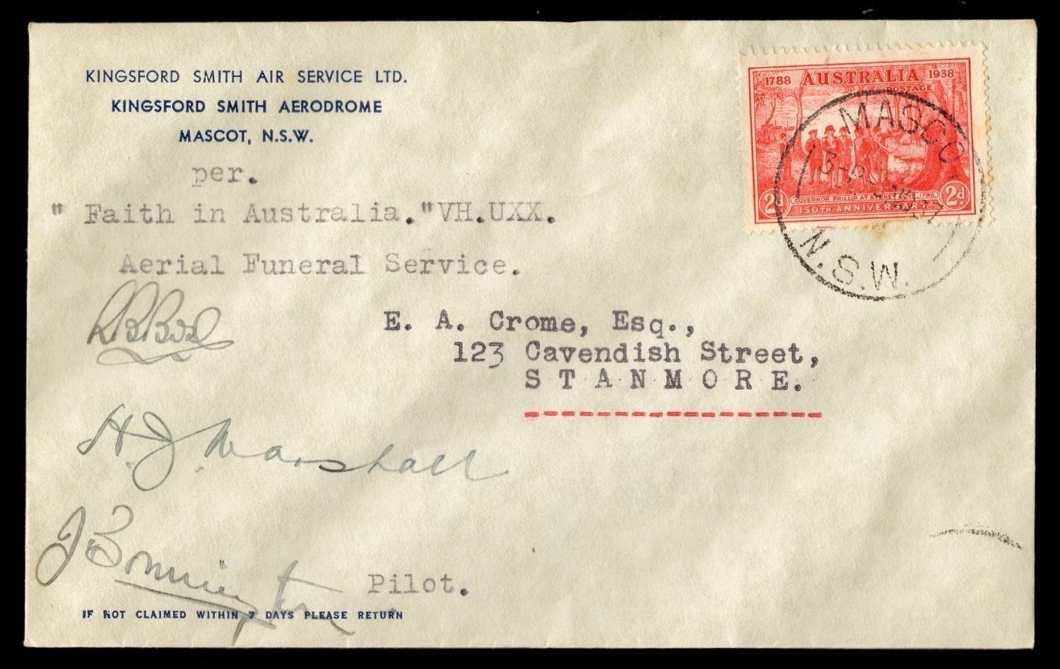5 November 1937 (AAMC.774) a cover flown aboard the "Faith in Australia" VH-UXX, signed by the pilot J.A. Bonnington and
