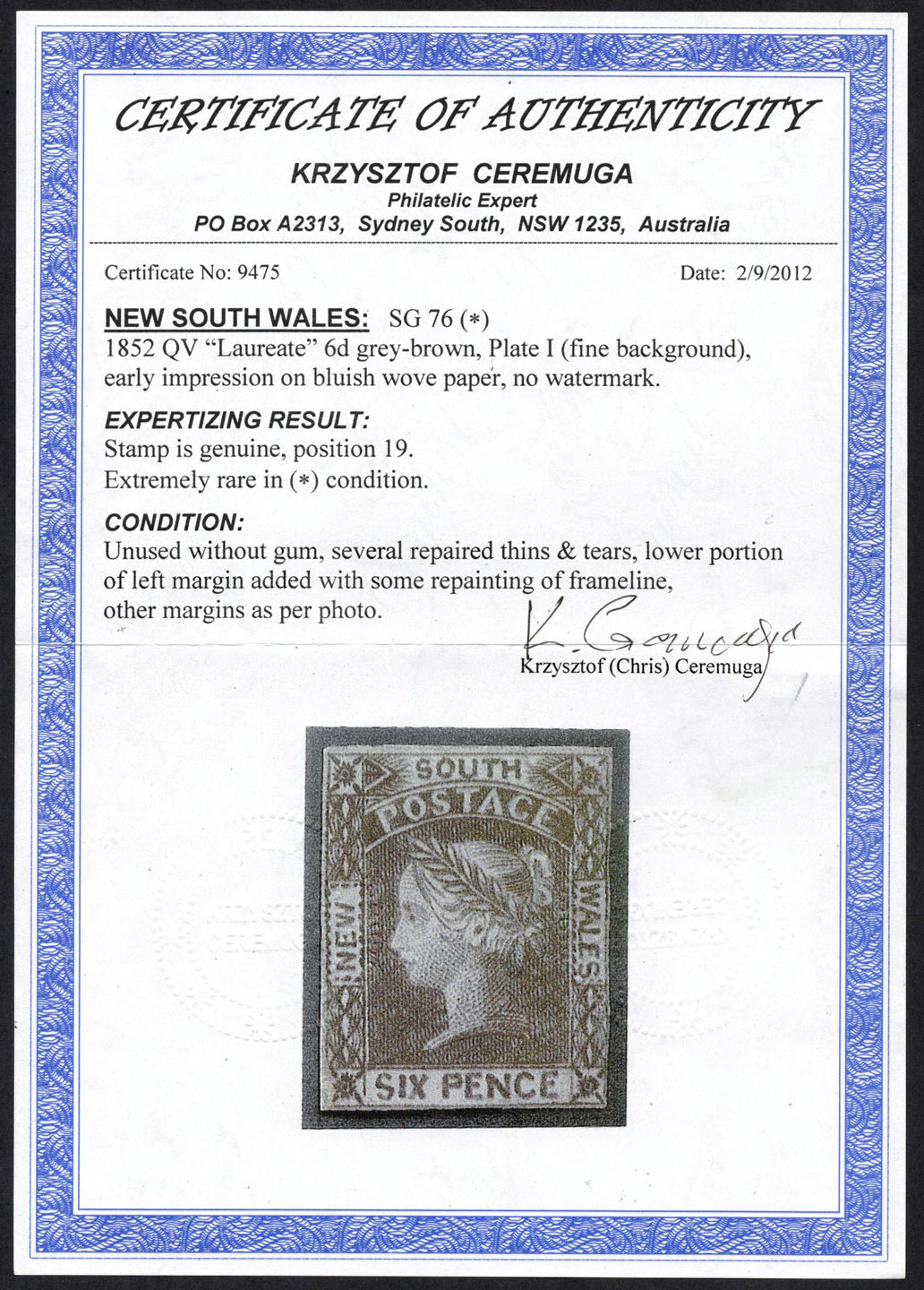 Ceremuga Certificate [2012] stating that the stamp is genuine (position 19); adding that there are several repairs. Cat.£7,500. (Image