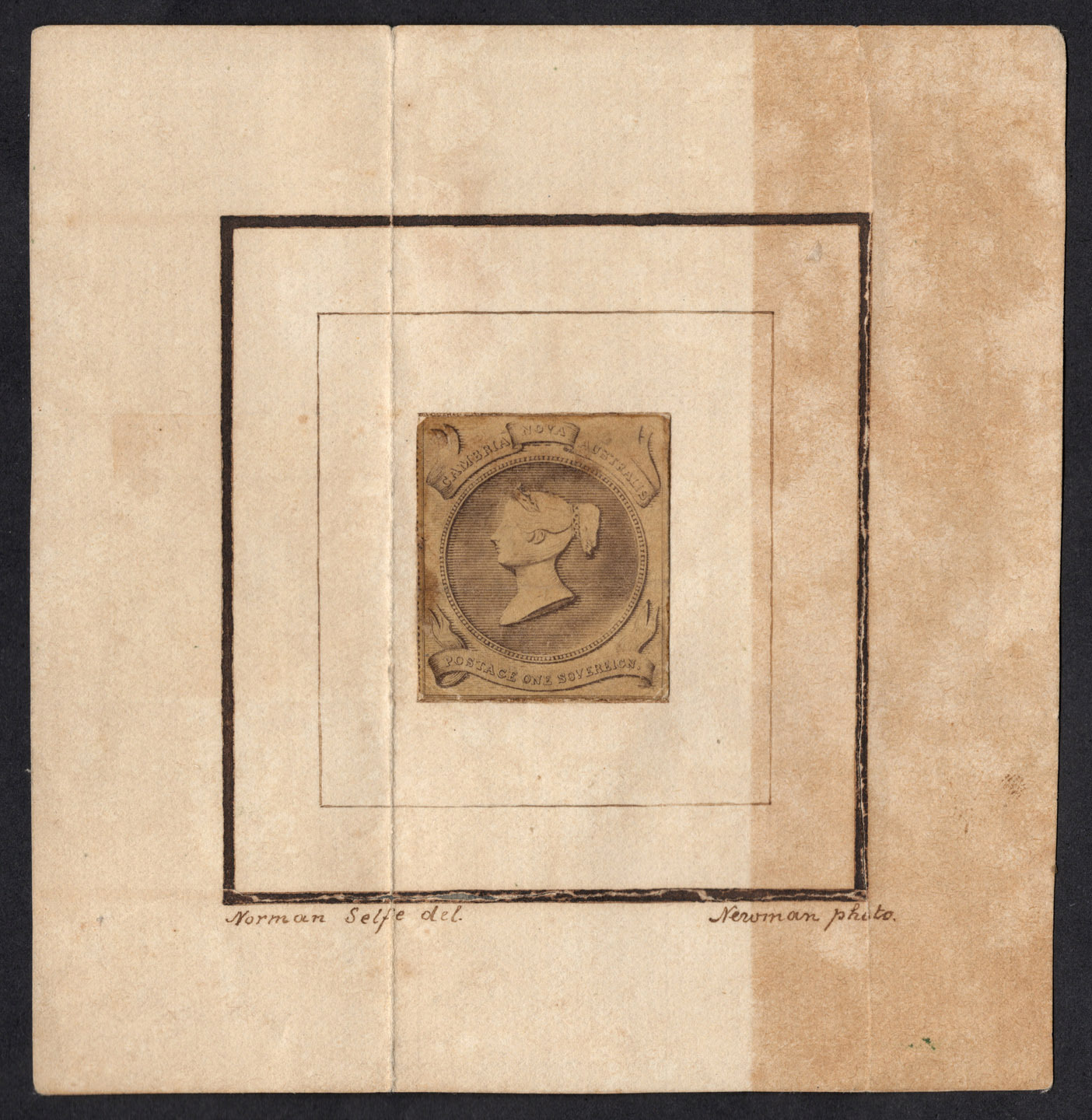 AUSTRALIS" (New South Wales) and "POSTAGE ONE SOVEREIGN" in ribbons at top and base The design measures 22 x 26mm on light card, in a framed border measuring 58 x 62mm with "Norman Selfe del."at lower left and