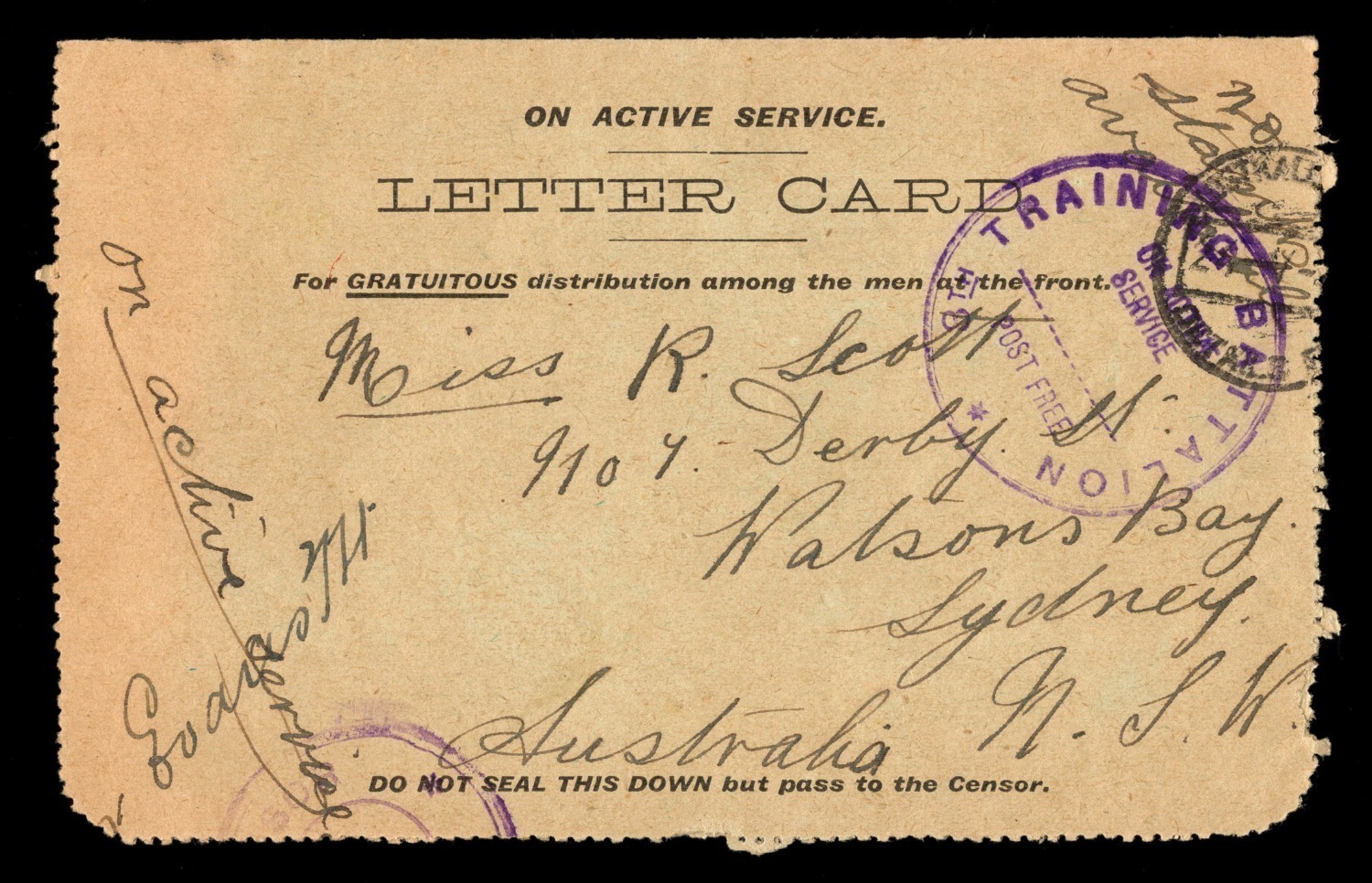 has been between 100 & 125 for a week.....If you hear that I am on the way back ring up Callan Park and order a cell for if I stay here much longer I will go mad..."; with large "TRAINING BATTALION POST FREE" cachet and