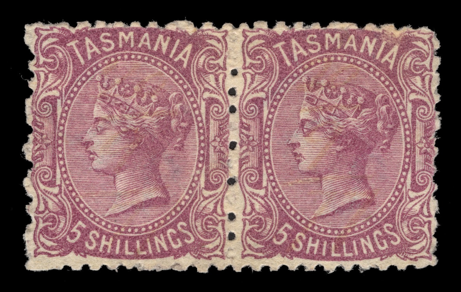 1871 (SG.149b) perf.11½, 5/- mauve, horizontal pair, large part o.g. Cat.£800. (Image 1)