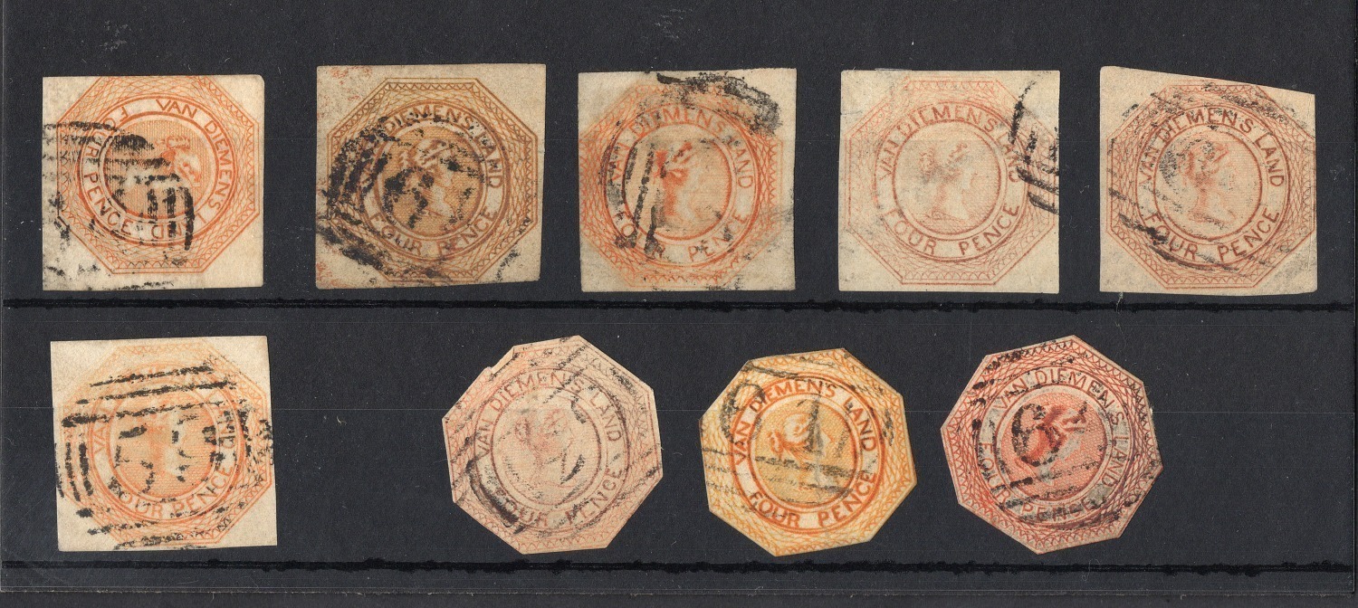 1853-54 4d Orange "Couriers", various shades and printings, (9, of which 6 are cut square and 3 are cut-to-shape) Used.