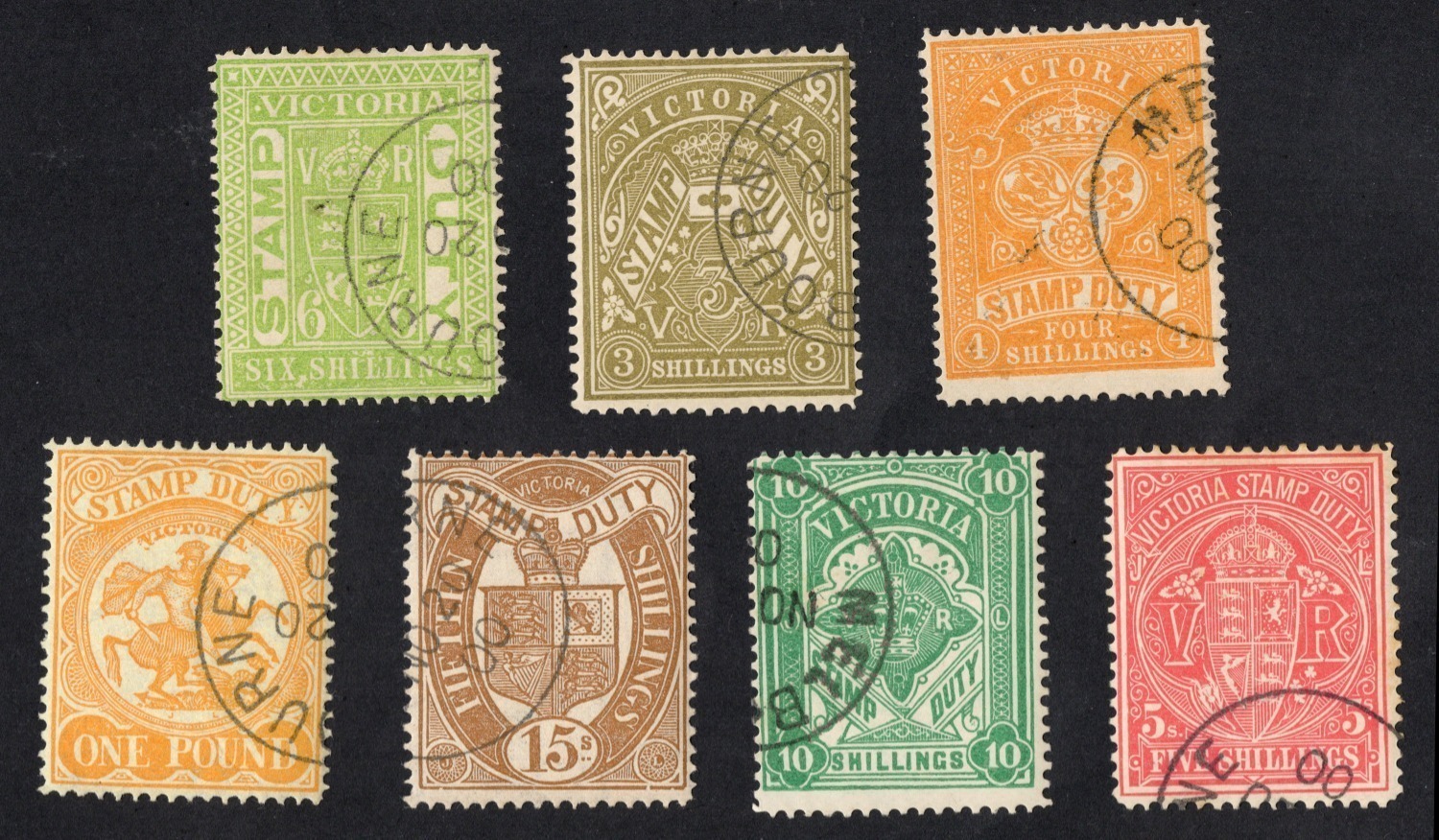 1884-96 (SG.268-277) 3/- drab - 45/- lilac "Stamp Duty" types authorized for postage, all CTO (with gum) at MELBOURNE in