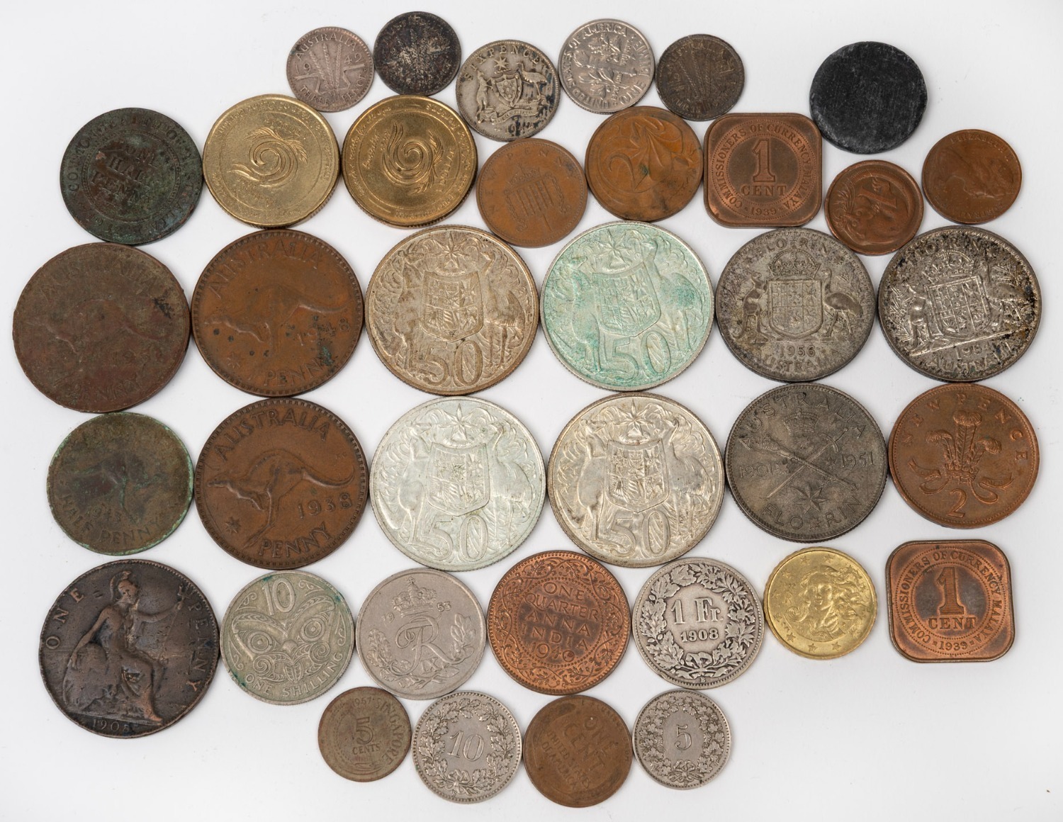 half-pennies, together with four 1966 round 50c coins, some other decimal Australian, as well as a quantity of foreign coins; all mixed condition. (qty.) (Image 1)
