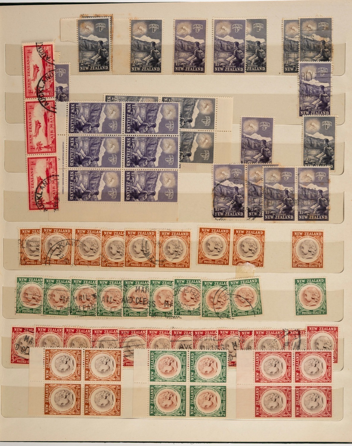 labels, 1913 Auckland Exhibition set Mint (plus low value extras), 1920 Peace sets M & U, the 1923 1d Map issue in blocks and singles, 1925 Dunedin Exhibition sets M & U, 1935 Jubilee sets M & U, 1940 Centenary sets M & U, and