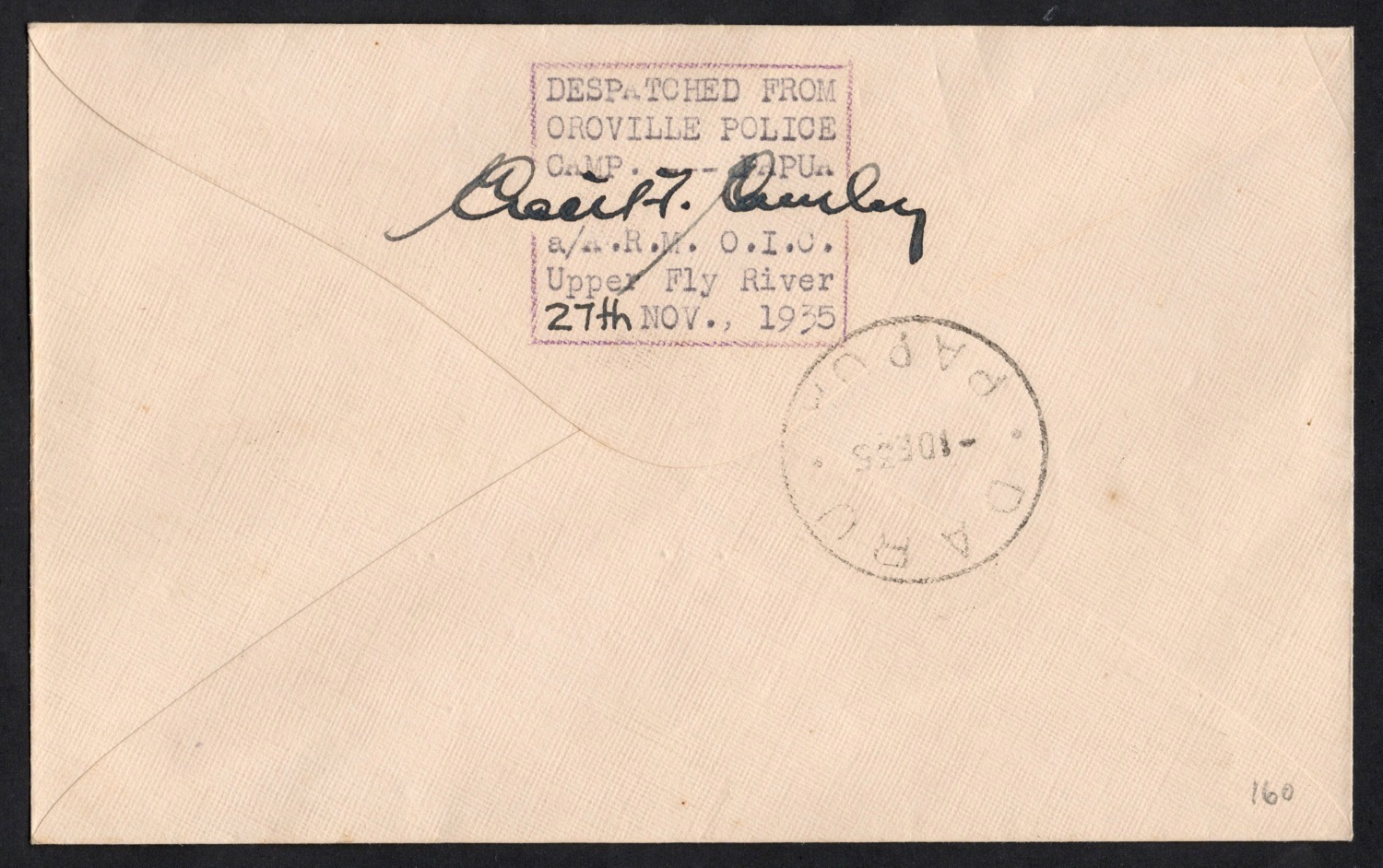 27 Nov. - 1 Dec. 1935 (AAMC. P95) Oroville (Police Camp) to Daru, flown cover; signed front and back by Cecil Cowley, who