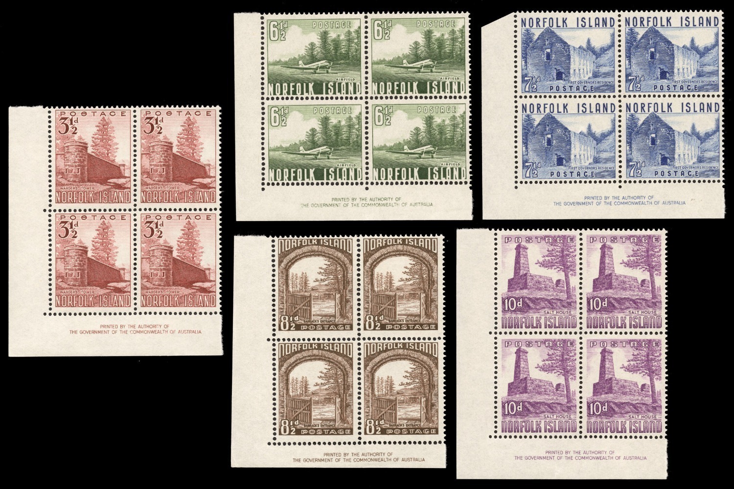 1953 (SG.13-18) 3½d - 5/- Pictorials, complete set in Authority Imprint blks.4, superb MUH. (24). (Image 1)