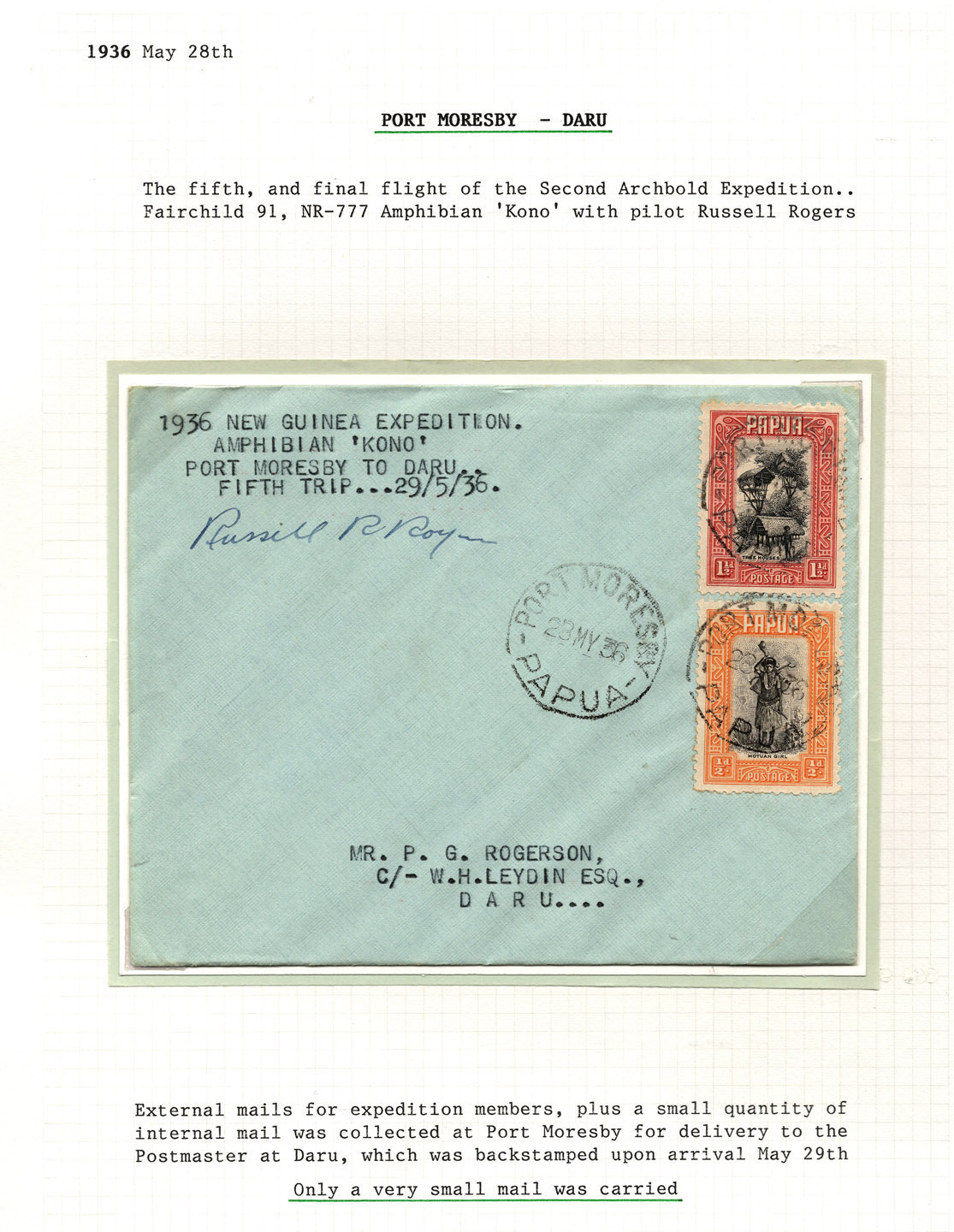28 May 1936 (AAMC.P103) Port Moresby - Daru cover, flown & signed by Russell Rogers, carried on the fifth and final flight of