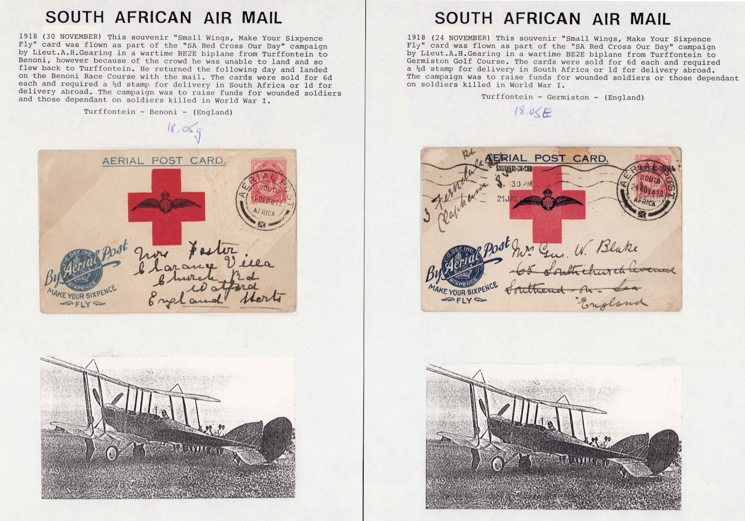 Nov.-Dec.1918 "Make Your Sixpence Fly" souvenir postcards flown by Lieutenant A.H. Gearing as part of the South African