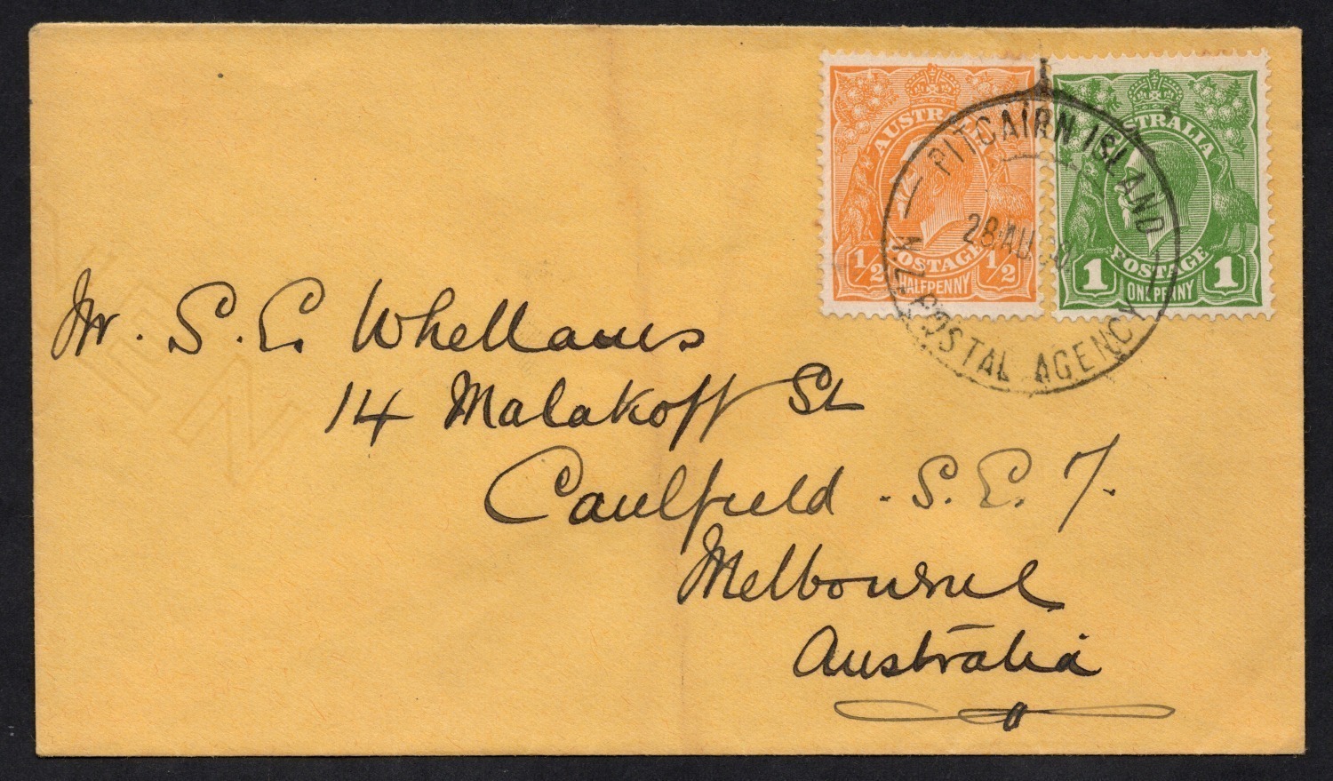 August 1930 cover to Melbourne, bearing Australian ½d + 1d KGV Heads attractively tied by the PITCAIRN ISLAND N.Z. POSTAL