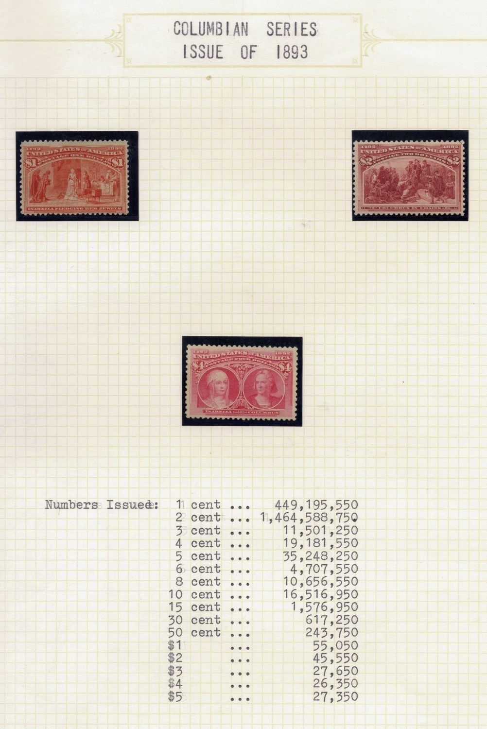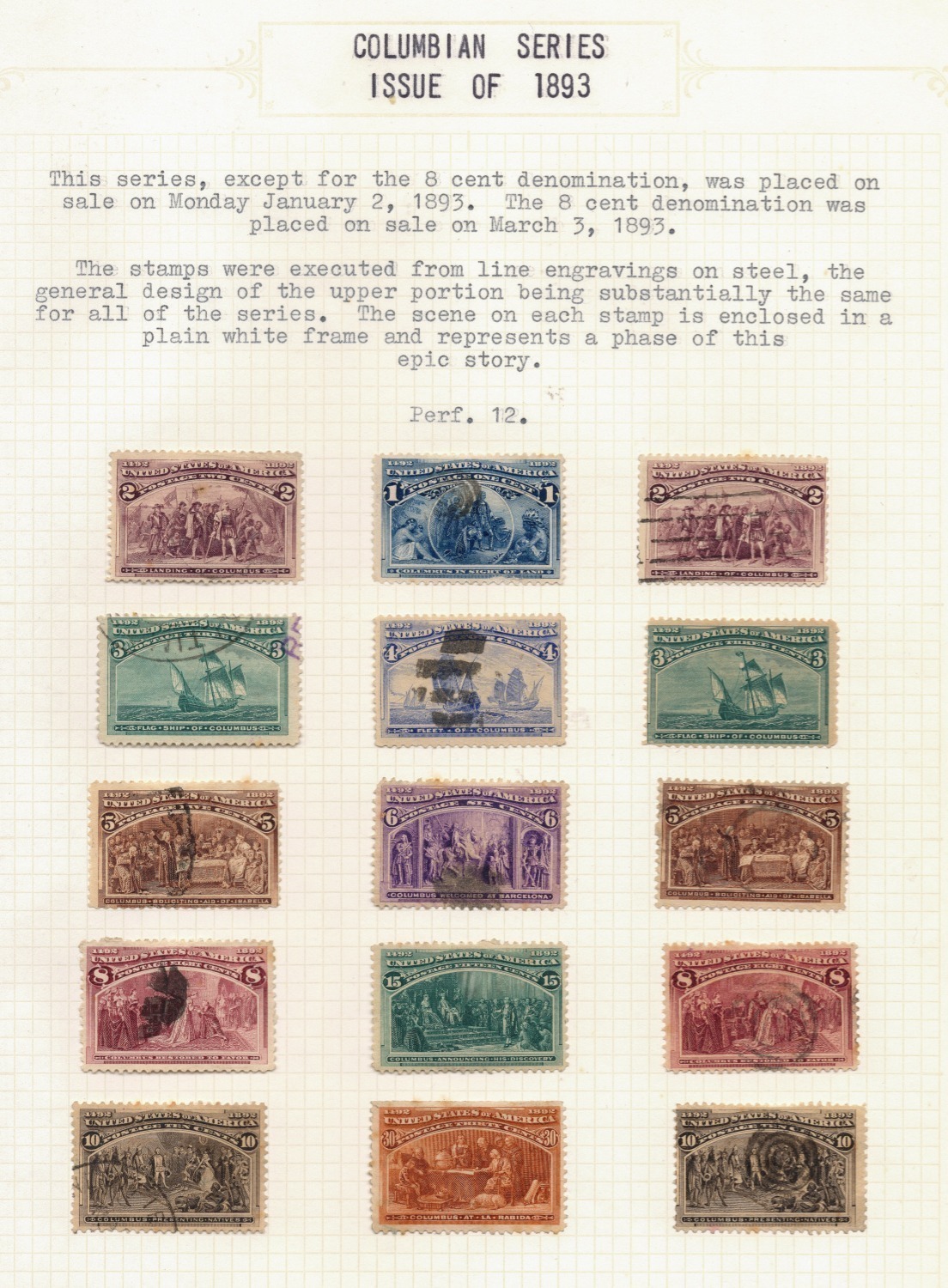 1893 COLUMBIAN EXPOSITION SERIES: 1c - 30c Used, plus the $1, $2 (weak top right corner perf.) and $4 Unused (appear to be mint