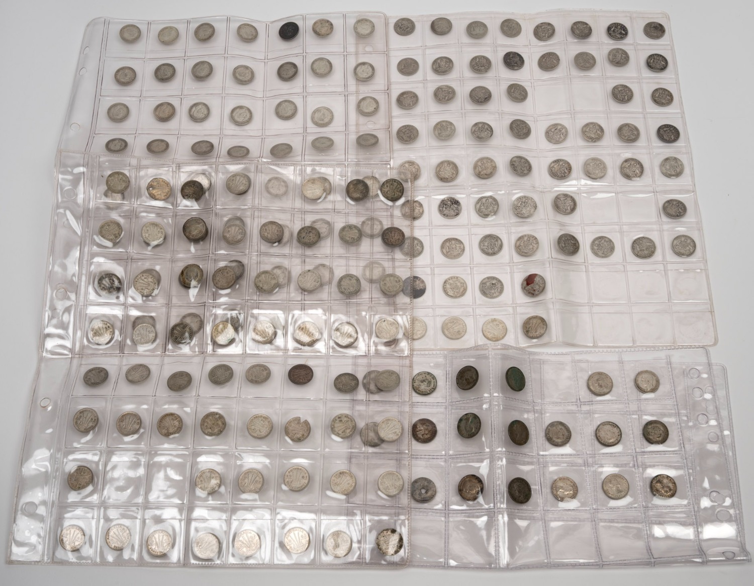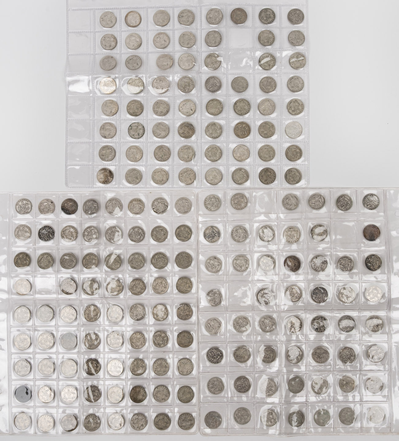 An accumulation of Australian pre-decimal coins comprising 53 threepences, 16 sixpences, 6 shillings, and 9 florins; mixed