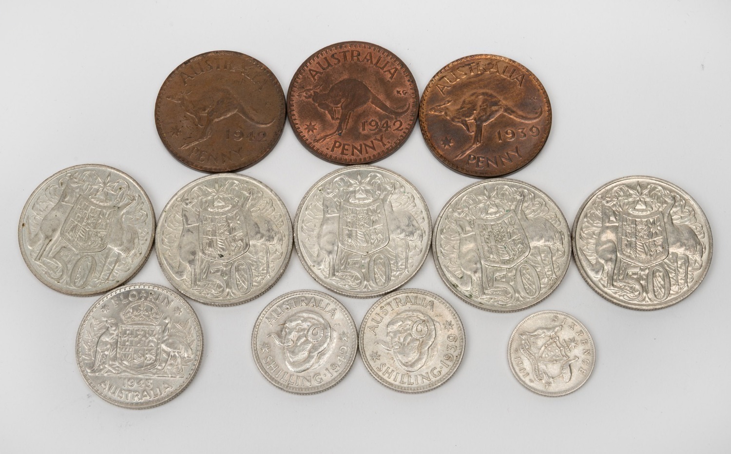 pennies, together with five 1966 round 50c coins (mixed condition). (12 items) (Image 1)