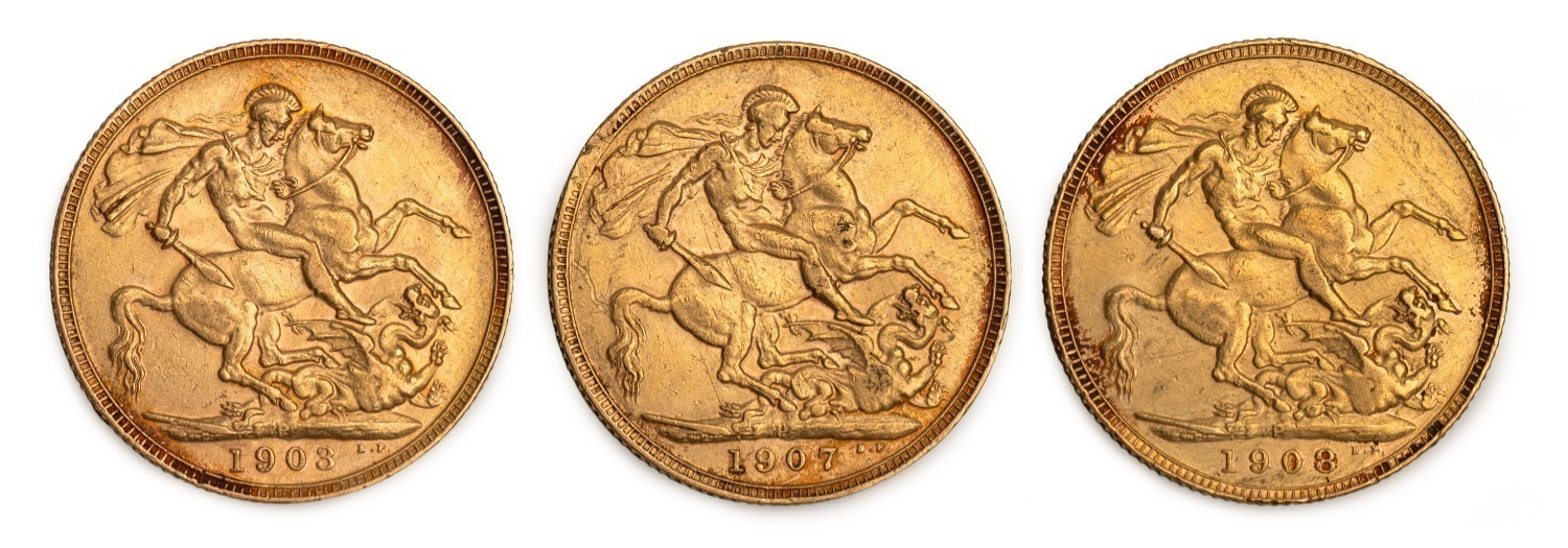 1903, 1907 and 1908 Sovereigns, Edward VII, St. George reverse, Perth Mint, (3). (Image 1)