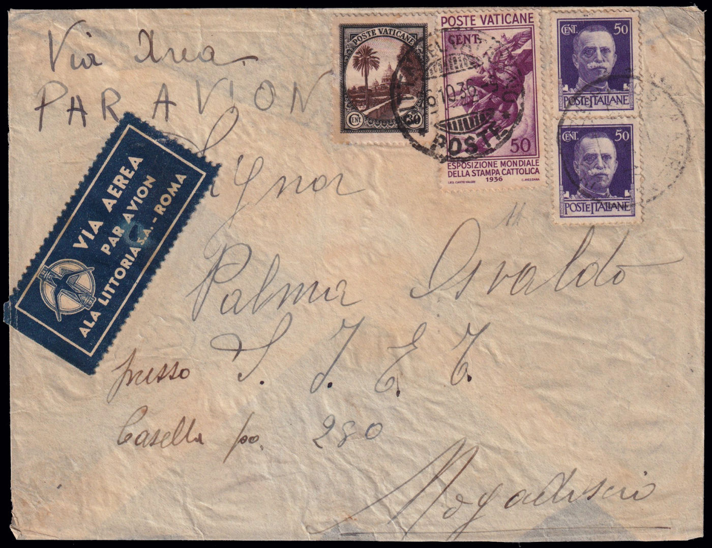 181 L imageAFFRANCATURA MISTA PER AOI. Lettera spedita via aerea da Città del Vaticano per Mogadiscio ed affrancata in tariffa 1,80 lire con combinazione serie Stampa Cattolica e Imperiale annullati in data 26/10/36. Timbro di arrivo al retro. Firma di garanzia A.Diena. (Image) (ImageA)