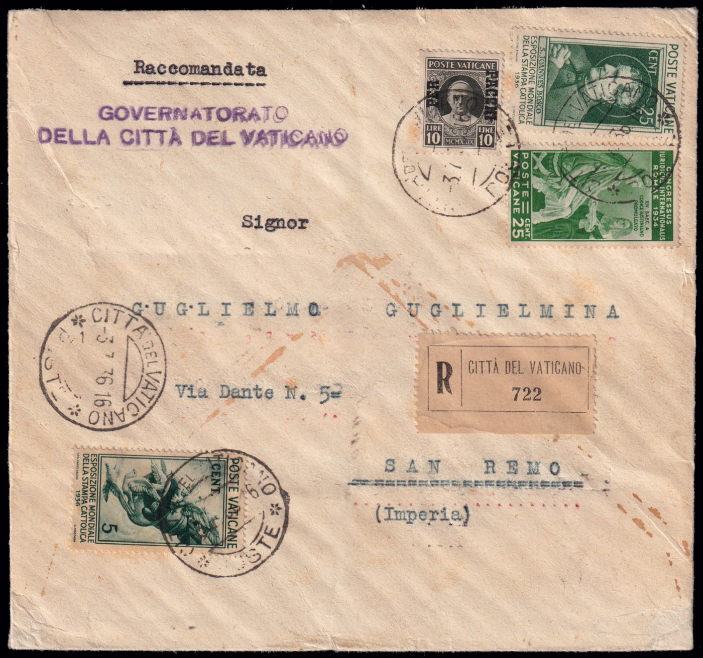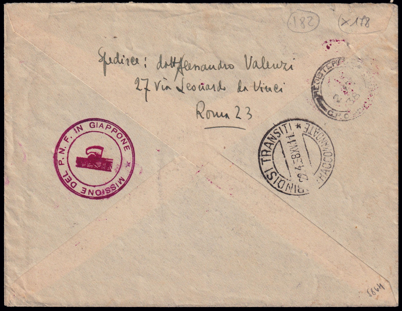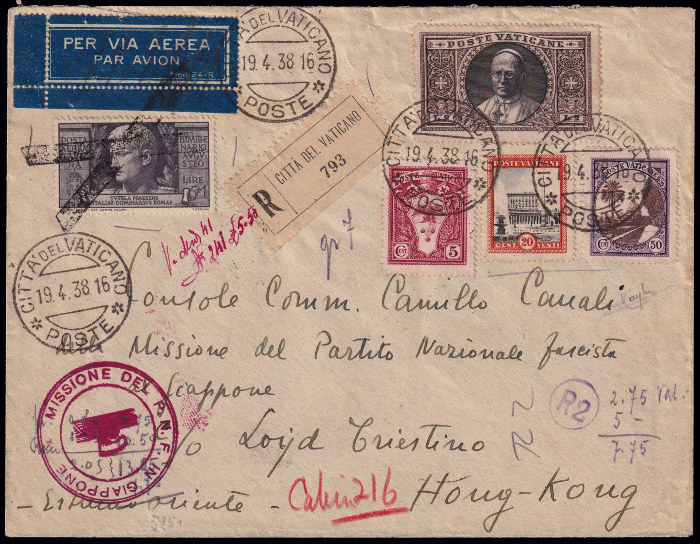 182 L imageMISSIONE DEL PNF IN GIAPPONE. Lettera raccomandata spedita da Città del Vaticano per Hong Kong il 19/4/1938 con affrancatura Vaticana per lire 2,75 e francobollo da 5+1 lire di posta aerea del Regno annullato con bollo muto perchè busta fatta proseguire via nave da Brindisi. Timbro di arrivo e transito. (Image) (ImageA)
