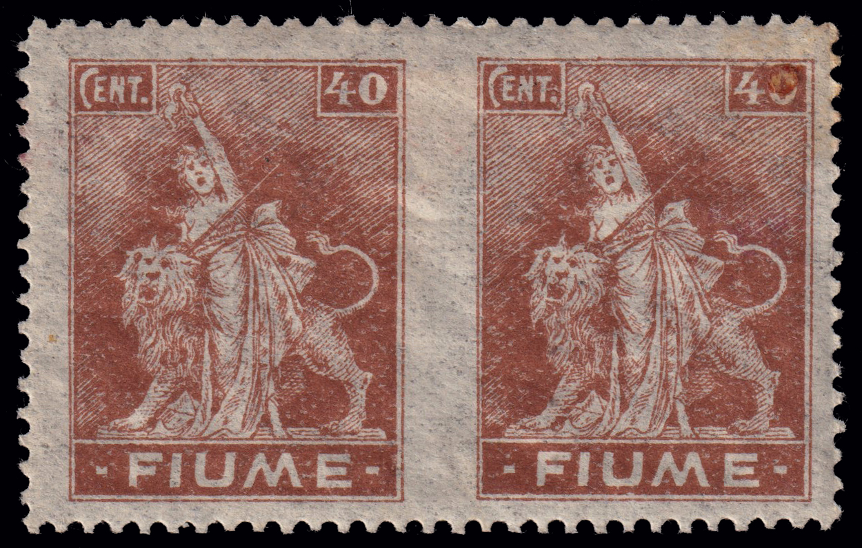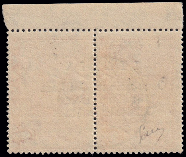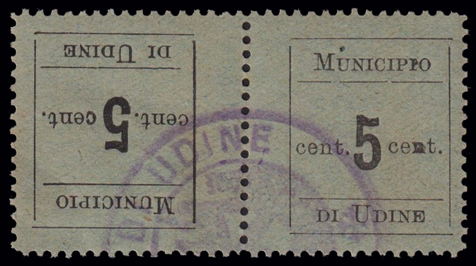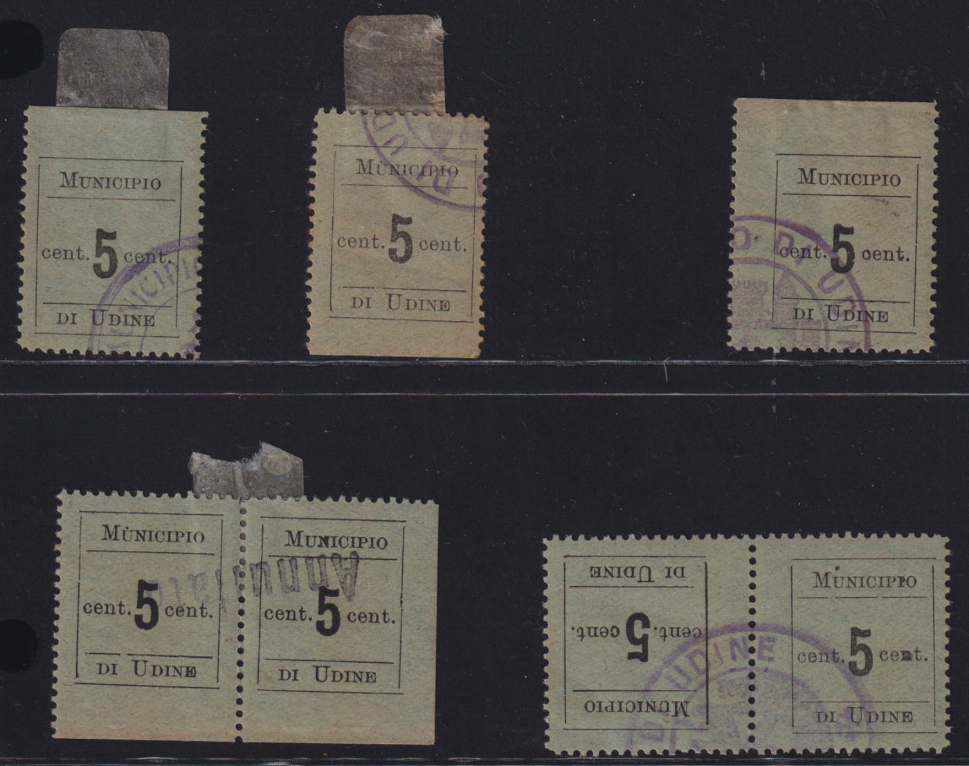 184 Z imageMARCHE DA 5 CENTESIMI PREANNULLATE. Lotto composto da 3 esemplari singoli non dentellati in alto (2) e in basso con accento sulla U di Udine (1) e 2 coppie orizzontali delle quali una con il valore di sinistra con accento sulla U di Udine e l'altra tete-beche con ampia distanza fra le vignette ben visibile confrontandola con l'altra coppia. (Image) (ImageA) (ImageB)