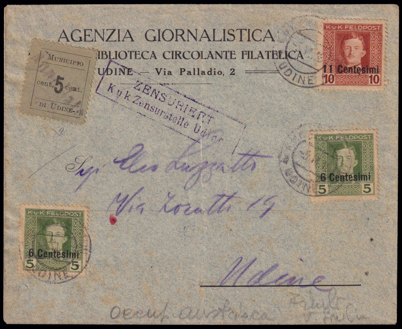 185 L imageUSO POSTALE. Marca da 5 centesimi dentellata su tutti i lati (n.1) usata annullata su busta spedita da Udine per città in data 5/VIII/18 ed affrancata con i valori soprastampati in centesimi (nn.4+6). Firma di garanzia E.Diena (Image) (ImageA)